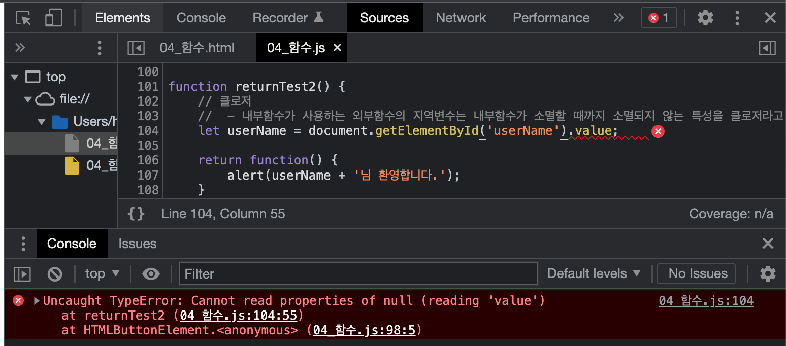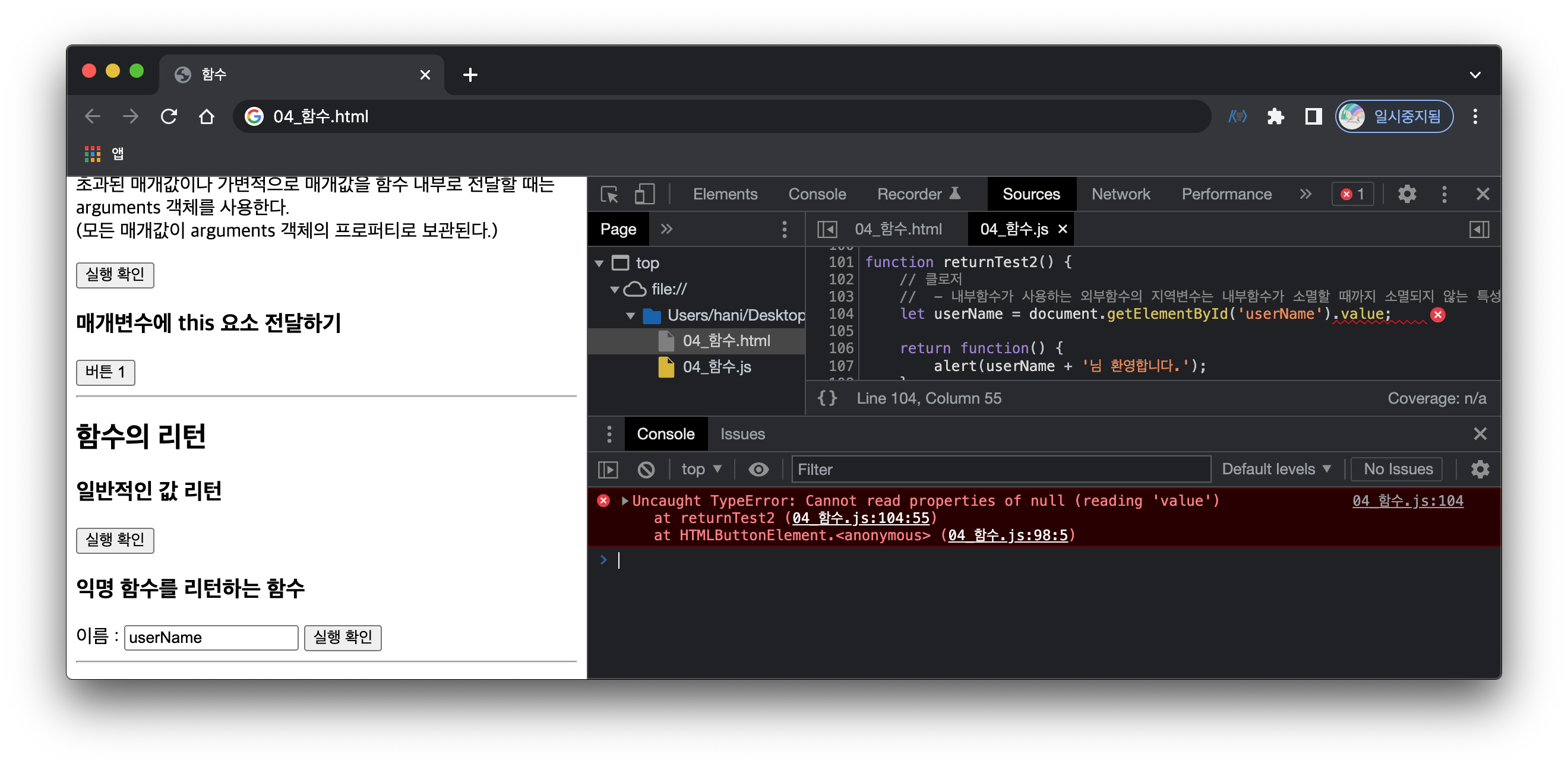 returnTest2()();에 에러가 뜨는데 일단 호출할 데이터가 null이라는 것 같아서 구글링을 해보았다.