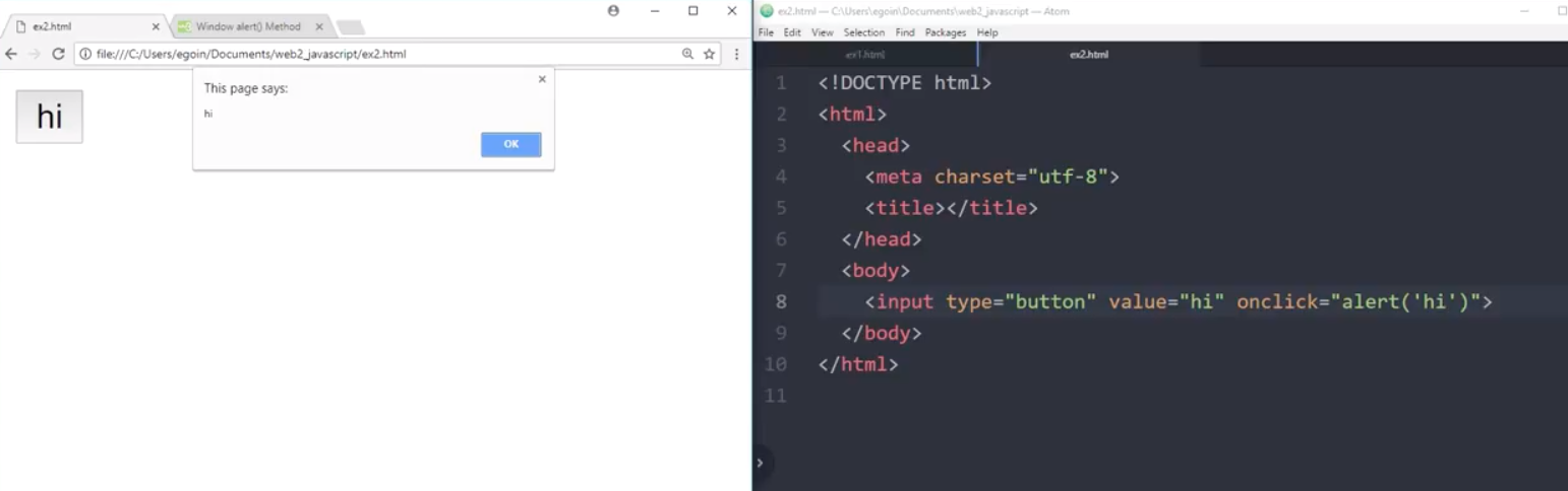 -> onclick 속성 값은 웹 브라우저가 기억하고 있다가 onclick 속성이 위치하고 있는 태그의 사용자가 클릭했을 때, 자바스크립트 코드를 자바스크립트 문법에 따라 웹브라우저가 동작할 것이다.