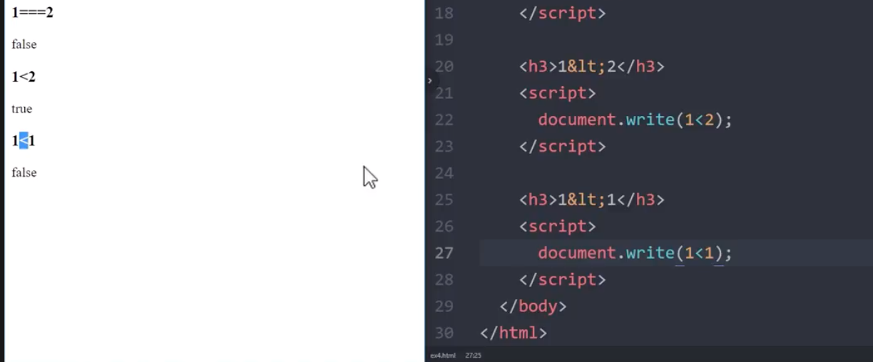 document.write(x>x),(x<x) 괄호 안 꺽쇠를 어떻게 바꾸느냐에 따라 true, false에 값이 달라지지만,