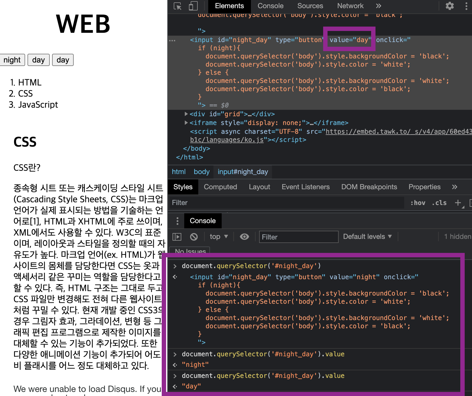 콘솔에서 night라고 나온 이유는 value값을 처음에는 night이라고 설정했기 때문.