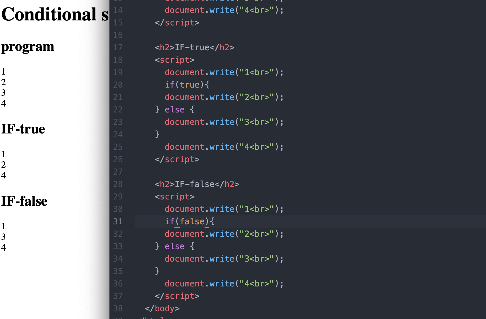 if (x) {y} else {z} -> 만약 괄호 안에 값이 x와 같다면 y가 실행되고, 그렇지 않다면 z가 실행되도록 한다.