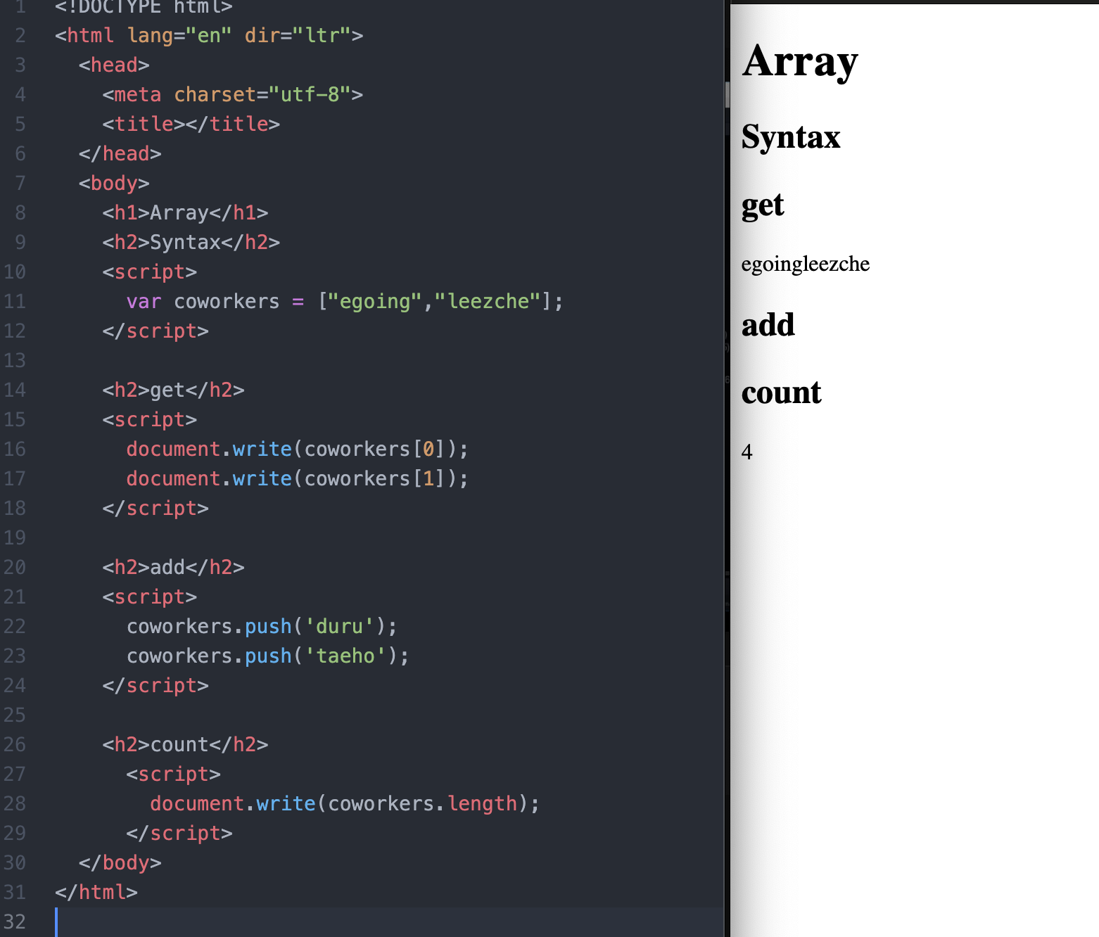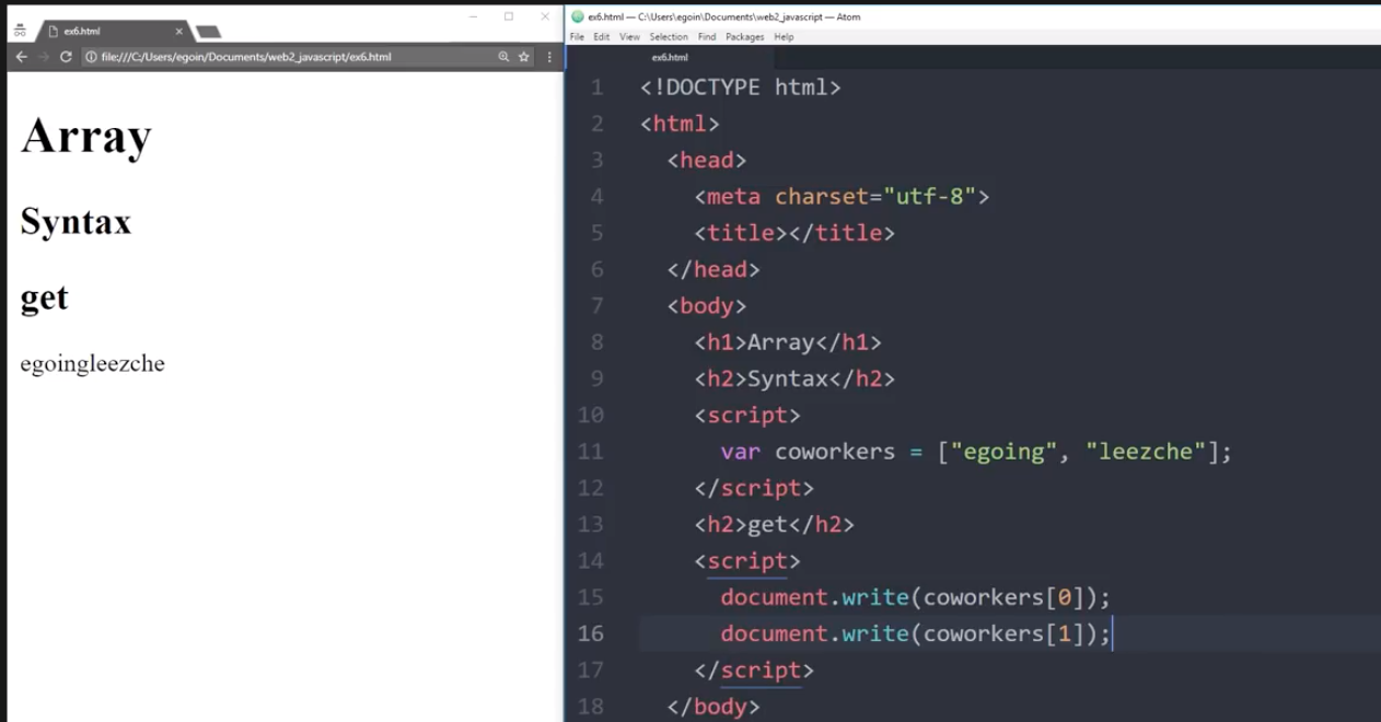 document.write(coworkers)라는 변수의 0번째 값 -> egoing