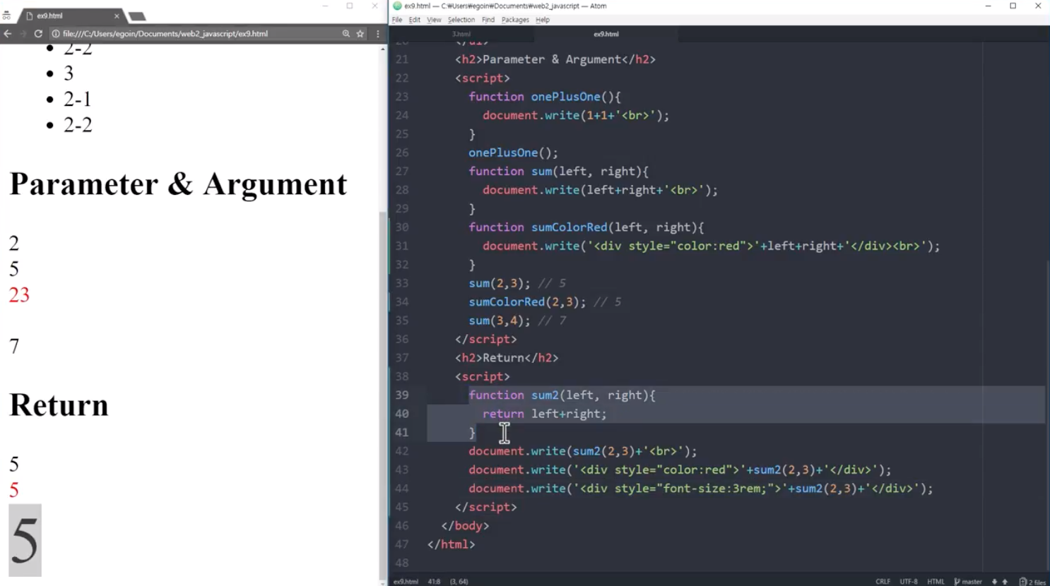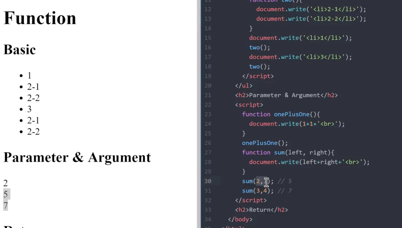sum2(함수)를 실행한 결과의 값을 돌려주는 것 ->return left+right(매개변수);