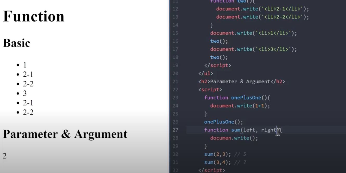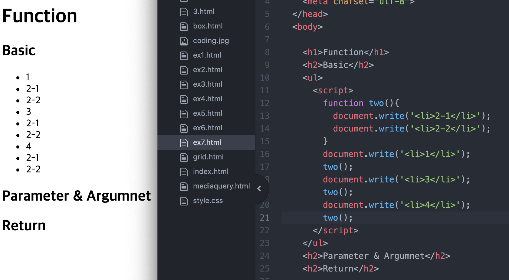 function 뒤에 함수 이름을 붙여준다-> ex) two(){ 함수 내용 }