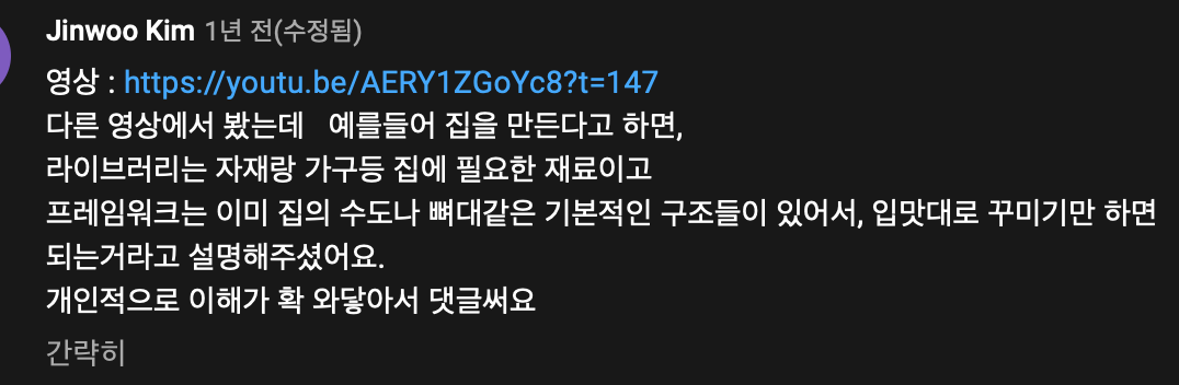 *library와 framework를 이해하기 쉬웠던 댓글을 통해 이해하기 쉬웠다.