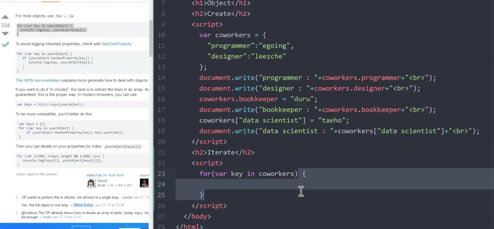 -> coworkers라는 변수가 가리키는 객체에 있는 키(key)값들을 가져오는 반복문