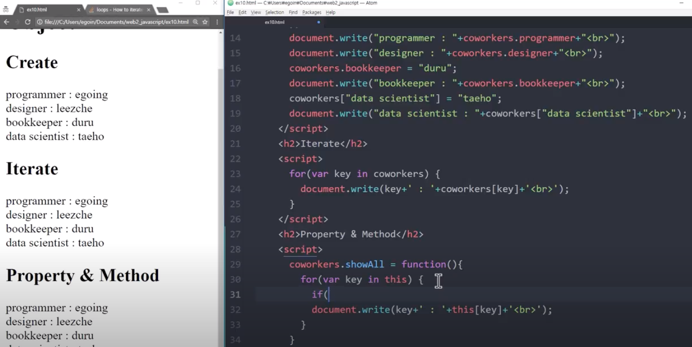 정보를 꺼내올때는 document.write("programmer :"+coworkers.programmer+"<br>");