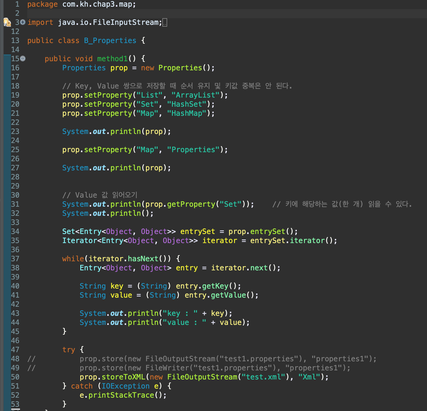 | 파일 입출력 | store(OutputStream out, String comments) | void | 바이트 스트림으로 저장된 정보를 파일에 출력 저장 |