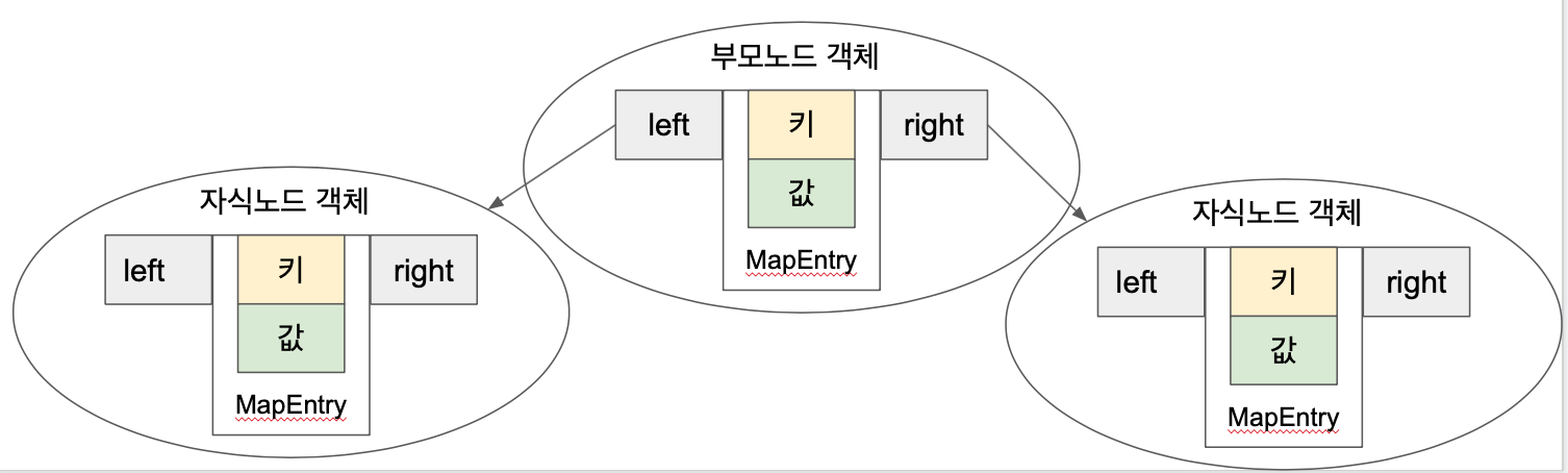-> 이진 트리를 기반으로 한 Map 컬렉션으로, 키와 값이 저장된 MapEntry를 저장하고 왼쪽과 오른쪽 자식 노드를 참조하기 위한 두 개의 변수로 구성된다.