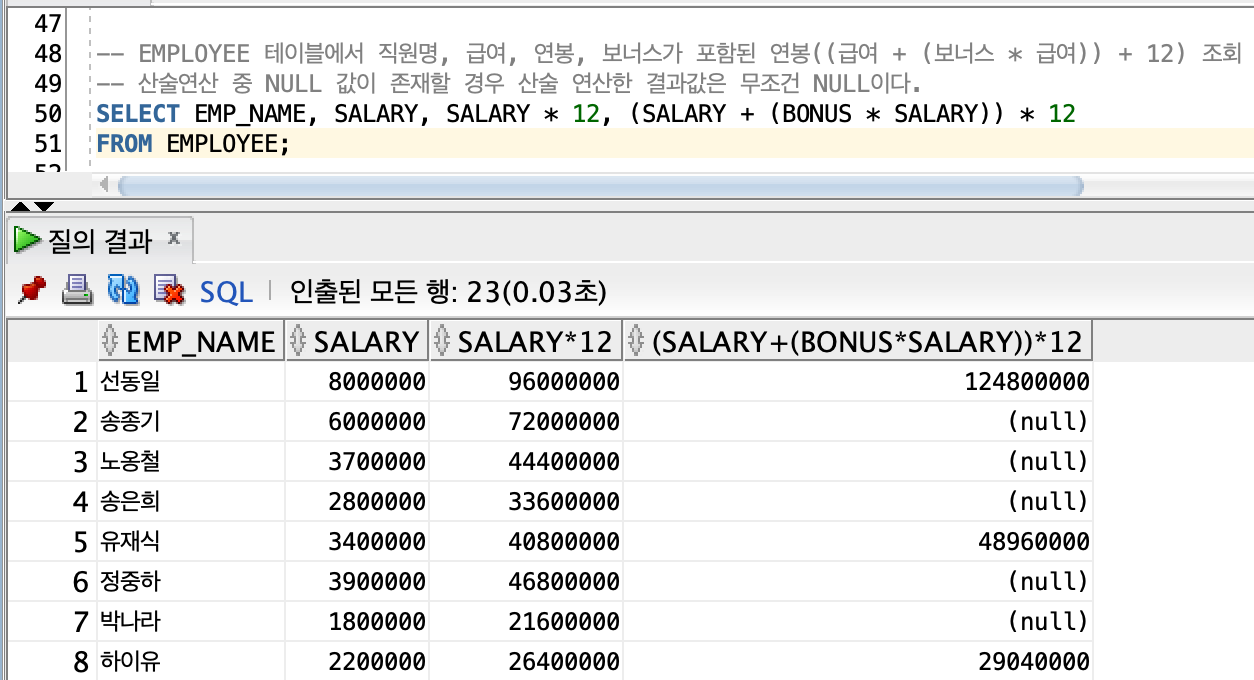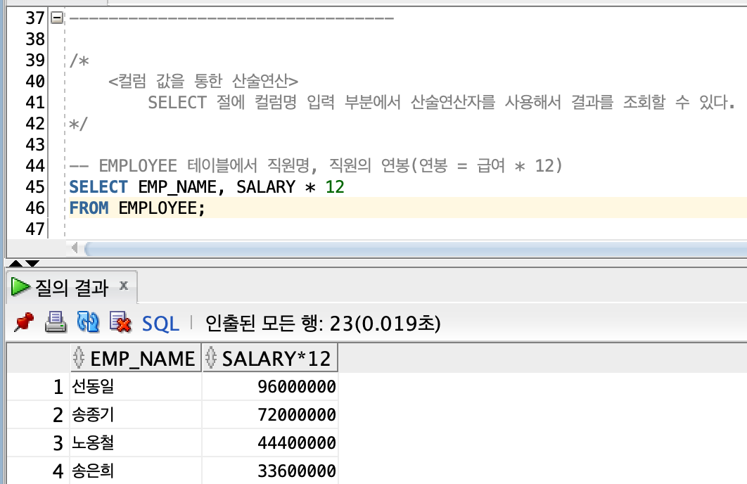 -> 컬럼 값에 대해 산술 연산한 결과 조회 가능