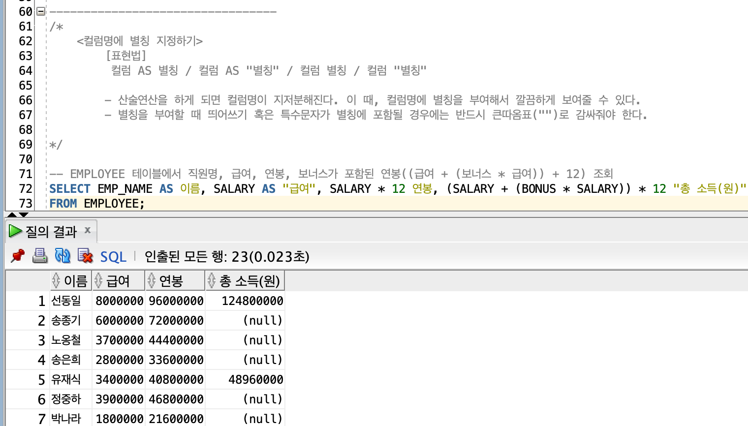 -> 'AS 별칭' 이나 "별칭", 또는 'AS "별칭"'을 기술하여 컬럼 별칭을 지을 수 있다.