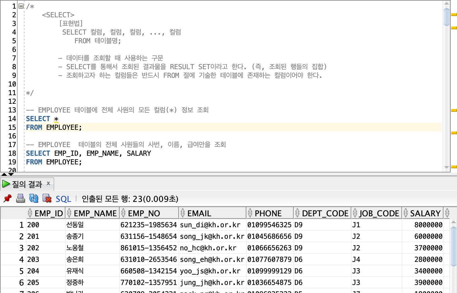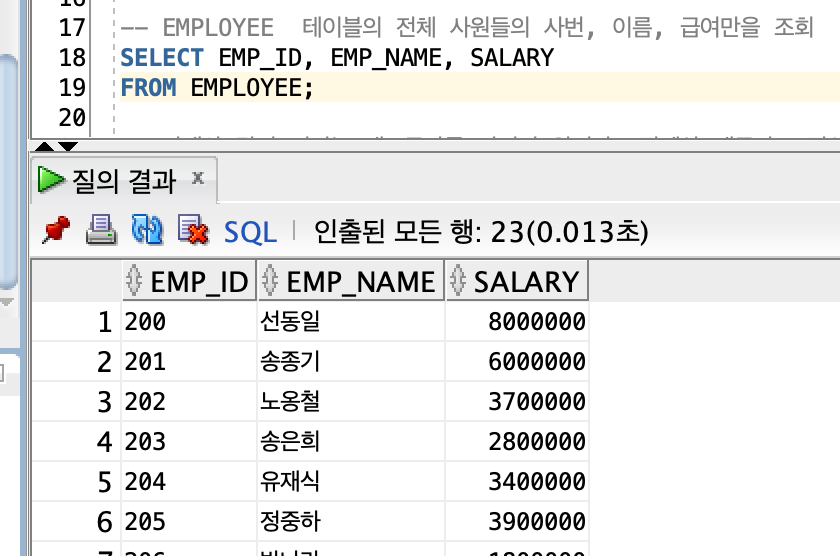 -> EMPLOYEE 테이블에 전체 사원의 모든 컬럼(*) 정보 조회 시 아래와 뜨는 것을 확인할 수 있었다.