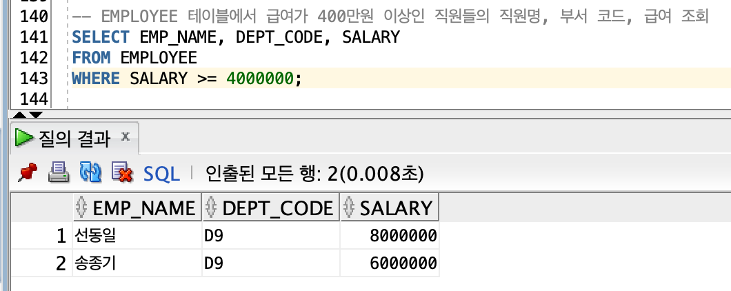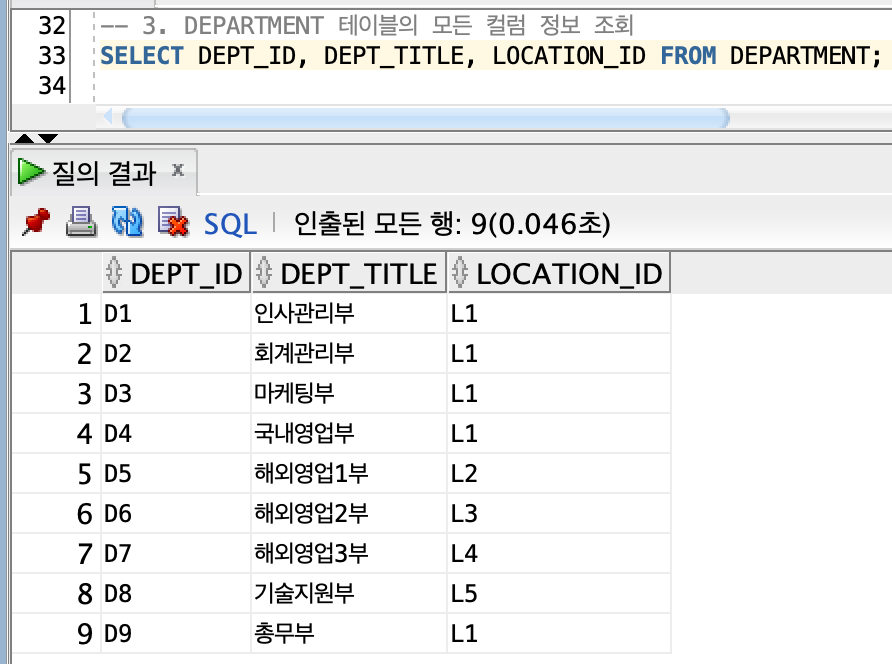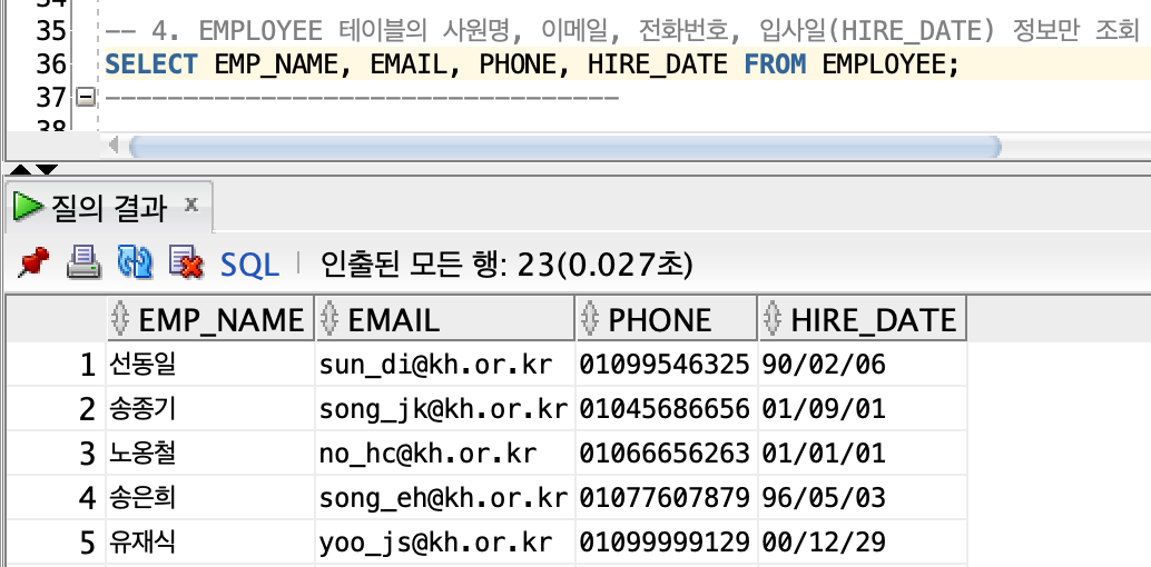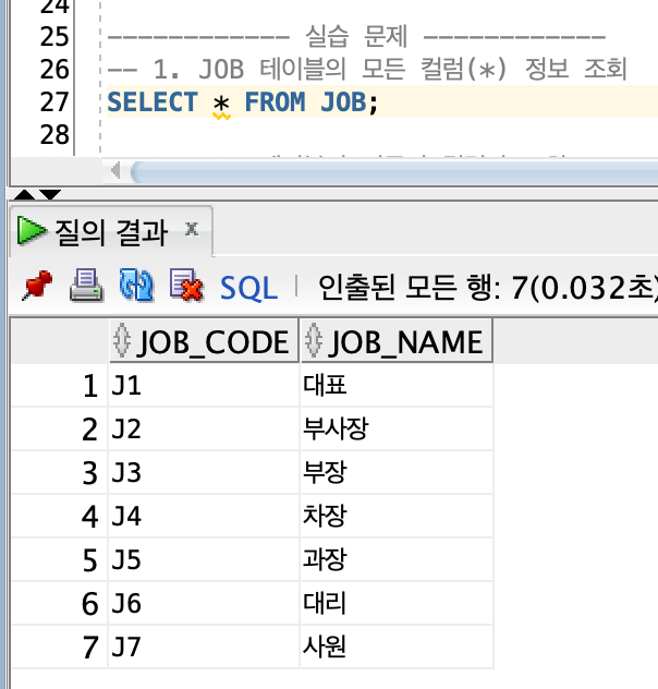 -> 모든 컬럼 조회 시 컬럼 명 대신 '*' 기호 사용이 가능하며, 조회 결과는 기술한 컬럼 명 순으로 표시된다.