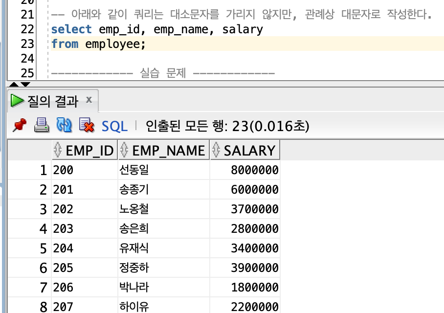 -> 쿼리는 대소문자를 가리지 않고 둘 다 실행이 되긴 하지만 관례적으로 대문자로 작성해야 한다.