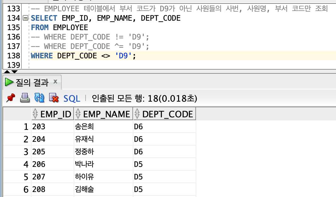 -> 단, 비교하는 두 컬럼 값/표현식은 서로 동일한 데이터 타입이어야 한다.
