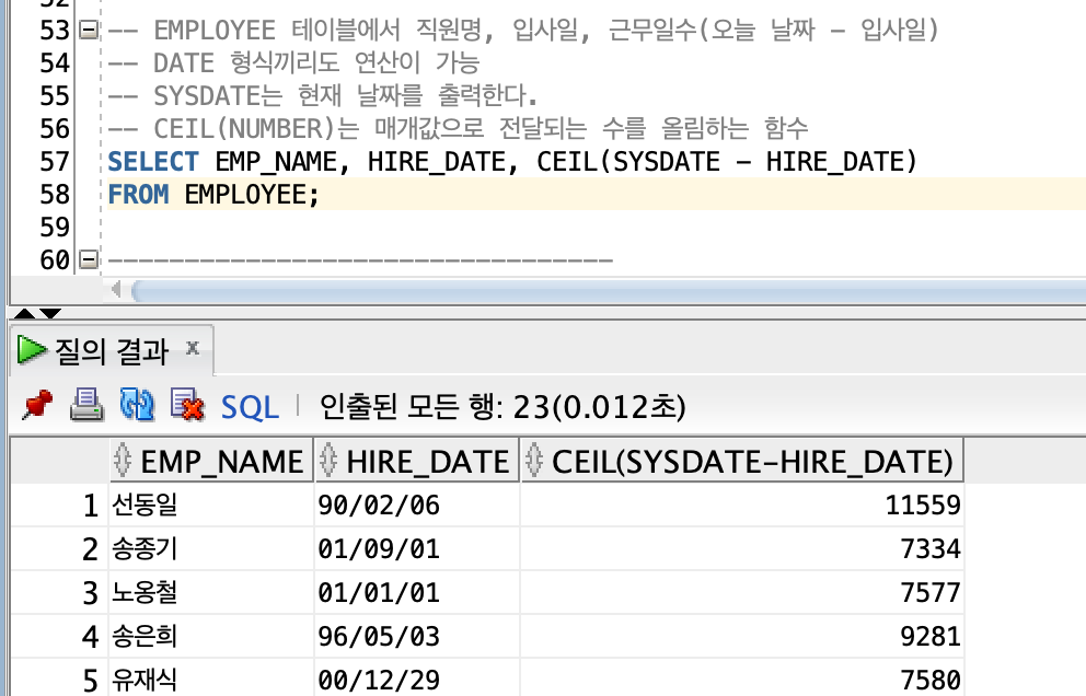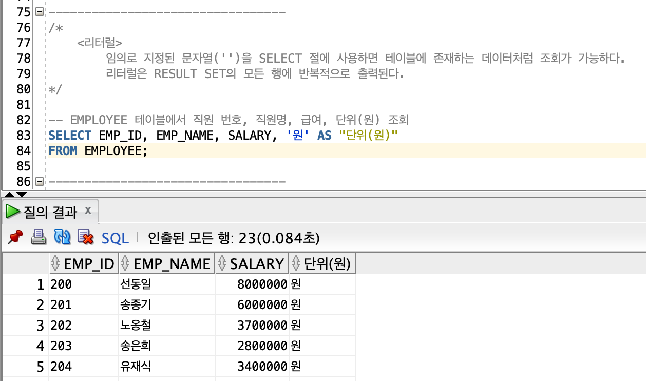 -> 임의로 지정한 '원'이라는 문자열을 SELECT절에 사용해줌으로써 테이블에 존재하는 데이터처럼 조회가 가능하며, RESULT SET의 모든 행에 반복적으로 출력 되는 것을 확인할 수 있었다.