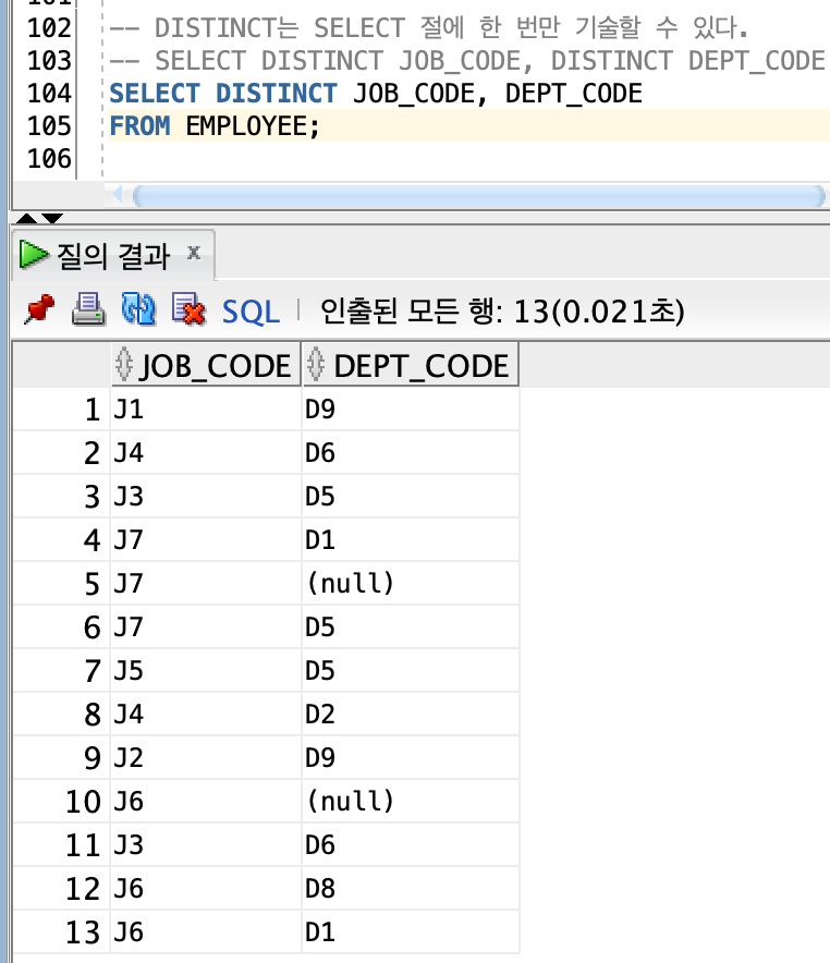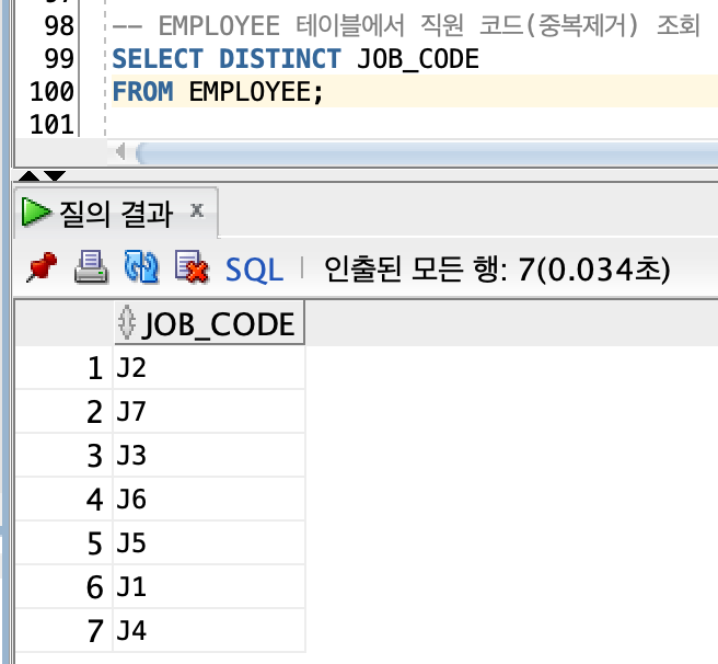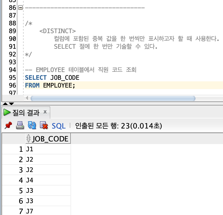 -> 컬럼에 포함된 데이터 중 중복 값을 제외하고 한 번 씩만 표시하고자 할 때 사용
