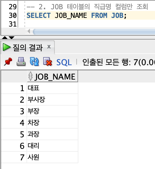 -> 여러 컬럼을 조회하는 경우 컬럼은 쉼표로 구분하고, 마지막 컬럼 다음은 쉼표를 사용하지 않음.