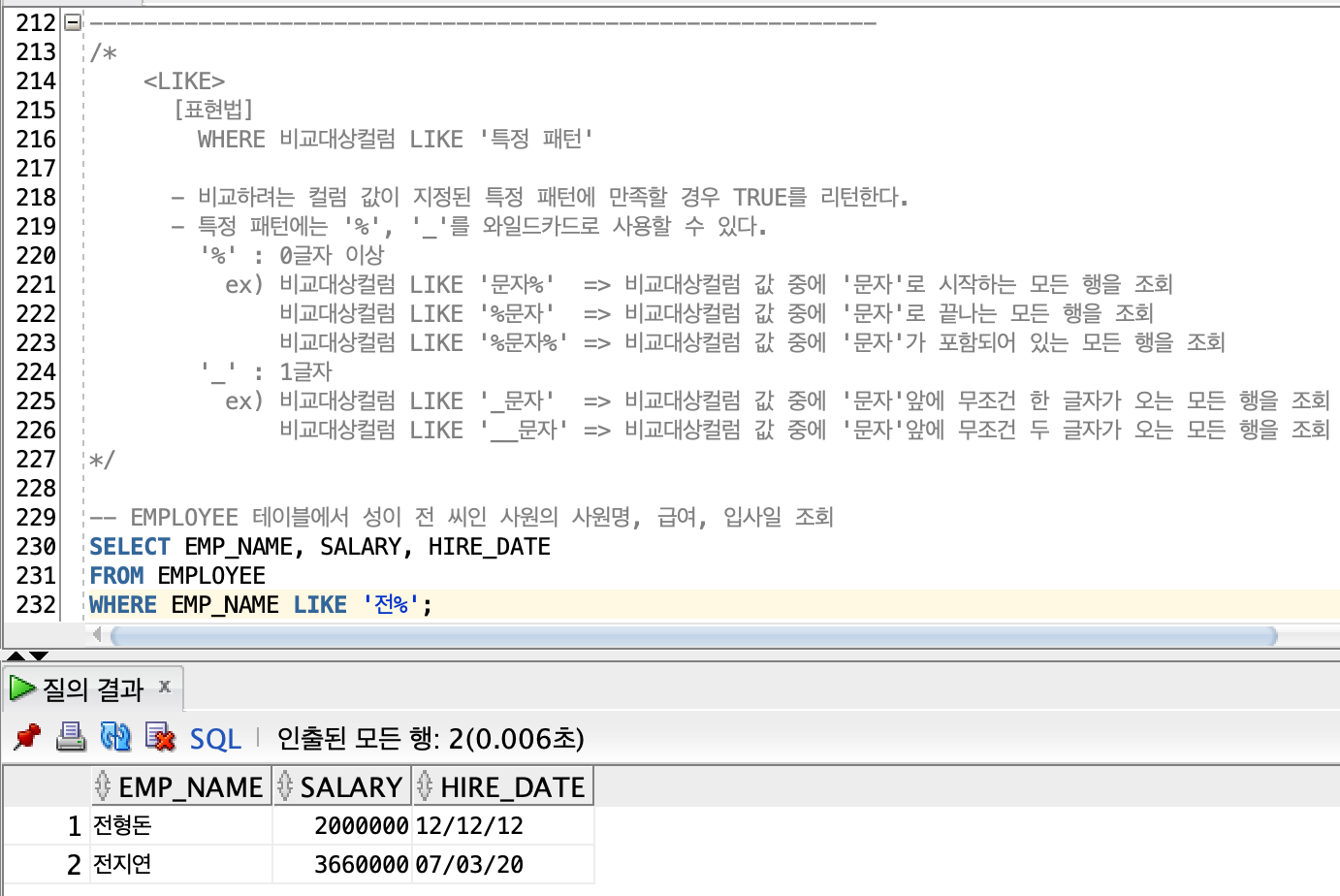 -> 비교하려는 값이 지정한 특정 패턴을 만족하면 TRUE를 리턴하는 연산자로 '%'와 '_'를 와일드카드로 사용한다.