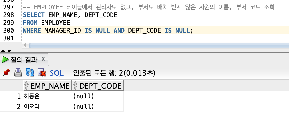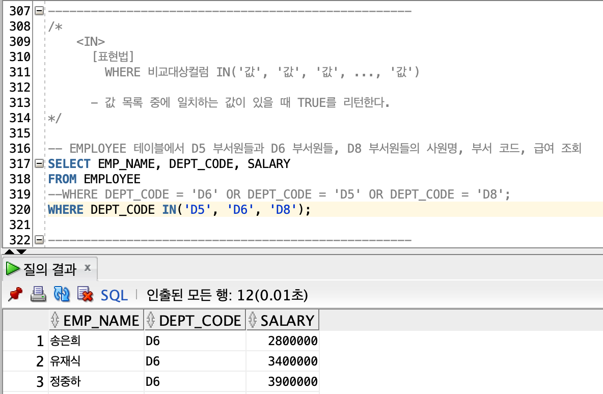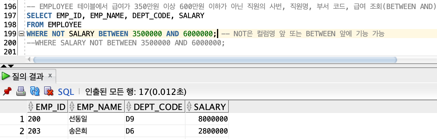 -> NOT은 컬럼명 앞이나 BETWEEN 앞에 적어야 한다.