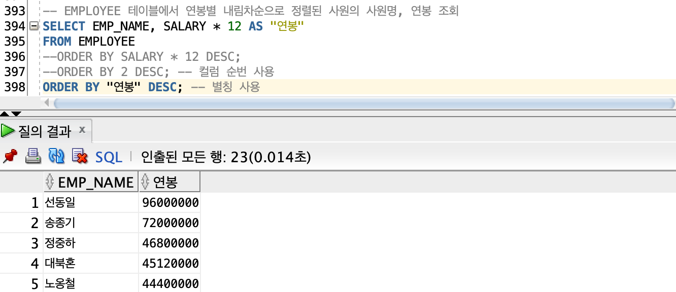 -> SELECT한 컬럼에 대해 정렬을 할 때 작성하는 구문으로 SELECT 구문의 가장 마지막에 작성하며, 실행 순서 역시 가장 마지막에 수행된다.