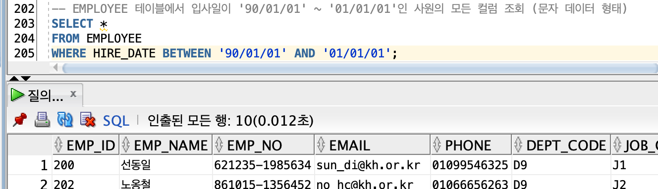 -> 문자 데이터 형태로도 BETWEEN | NOT BETWEEN 비교 연산이 가능하다.