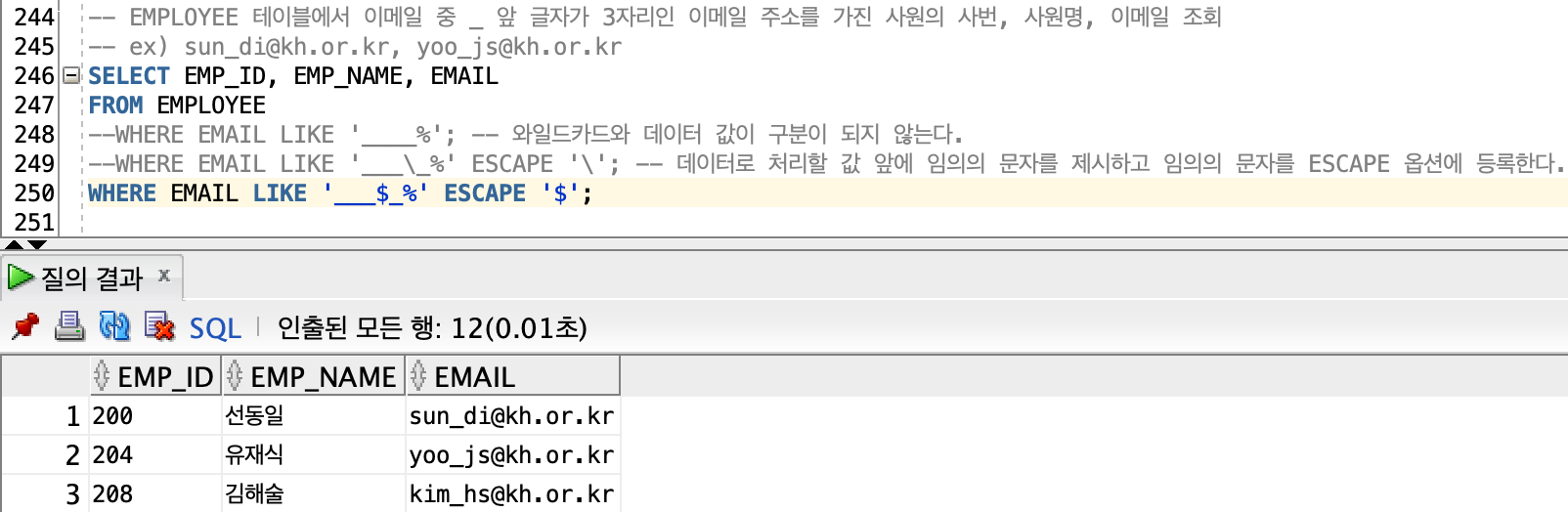 -> 와일드 카드 문자와 패턴의 특수문자가 동일한 경우 어떤 것을 패턴으로 결정하는지 구분하지 못하기 때문에 데이터로 처리할 와일드 카드 문자 패턴 기호 앞에 임의의 특수문자를 사용하고 ESCAPE OPTION으로 등록하여 처리한다.