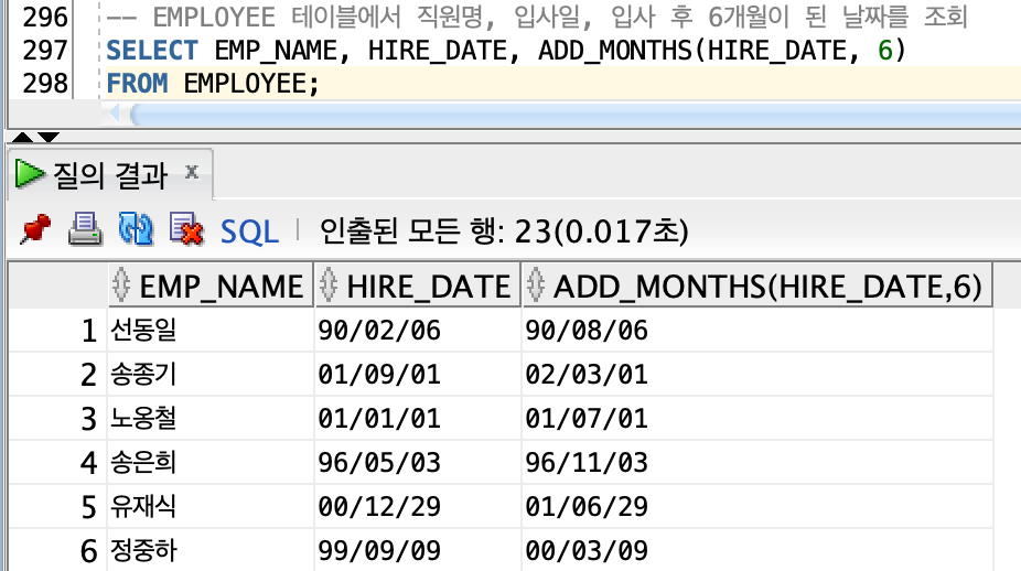 | ADD_MONTHS | DATE | DATE | 특정 날짜에 개월 수를 더하여 반환 |