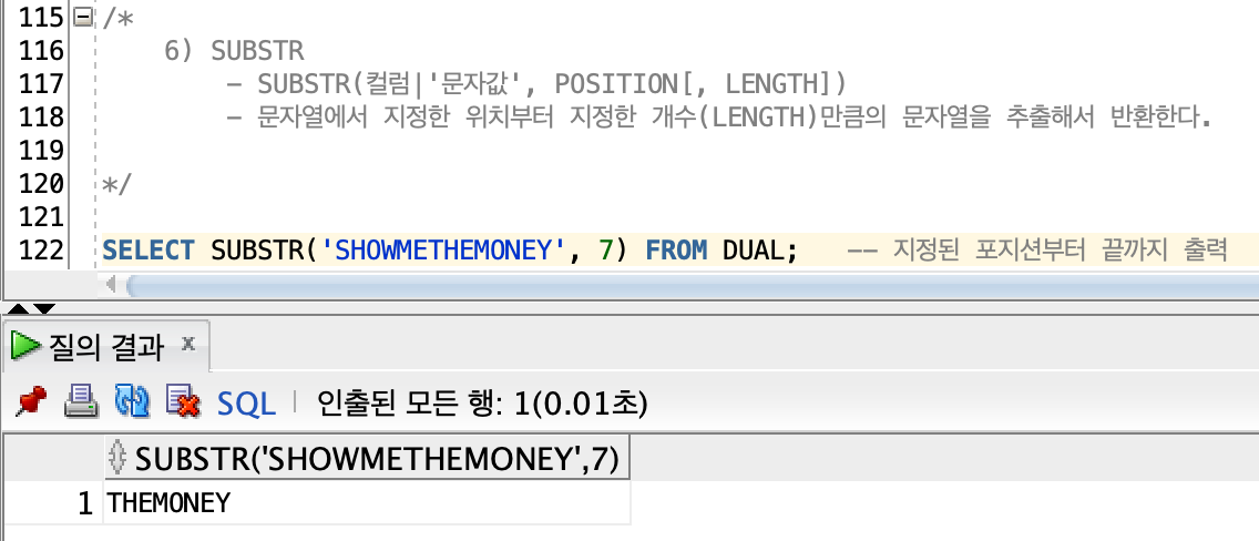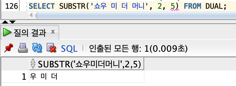 -> 컬럼이나 문자열에서 지정한 위치부터 지정한 개수의 문자열을 잘라내어 반환