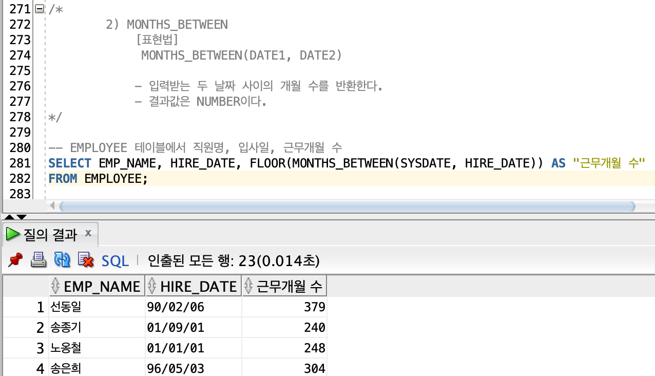 | MONTHS_BETWEEN | DATE | NUMBER | 두 날짜를 전달받아 몇 개월 차이인지 계산하여 반환 |