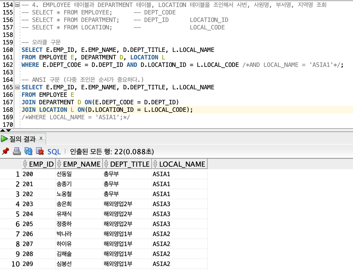 -> 실습문제 4) EMPLOYEE 테이블과 DEPARTMENT 테이블, LOCATION 테이블을 조인해서 사번, 사원명, 부서명, 지역명 조회