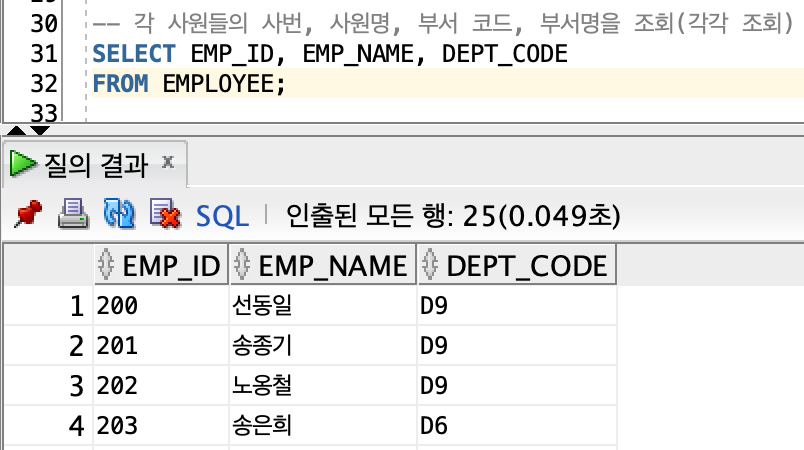 -> 각 사원들의 사번, 사원명, 부서 코드, 부서명 조회 (각각)