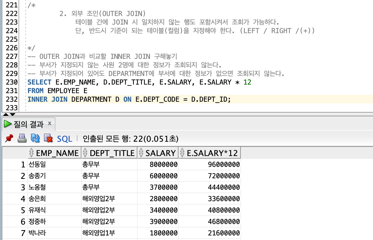 -> OUTER JOIN은 일치하지 않은 값도 포함이 되며, 반드시 OUTER JOIN을 명시해줘야 한다.
