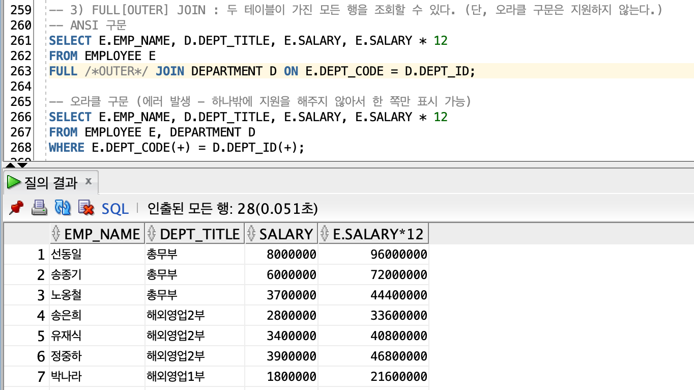 -> 오라클 : 왼쪽, 오른쪽, 전체 테이블을 나누지 않고 보여주고 싶은 해당 컬럼 쪽에 + 연산자를 사용해 주며, WHERE절에서 명시