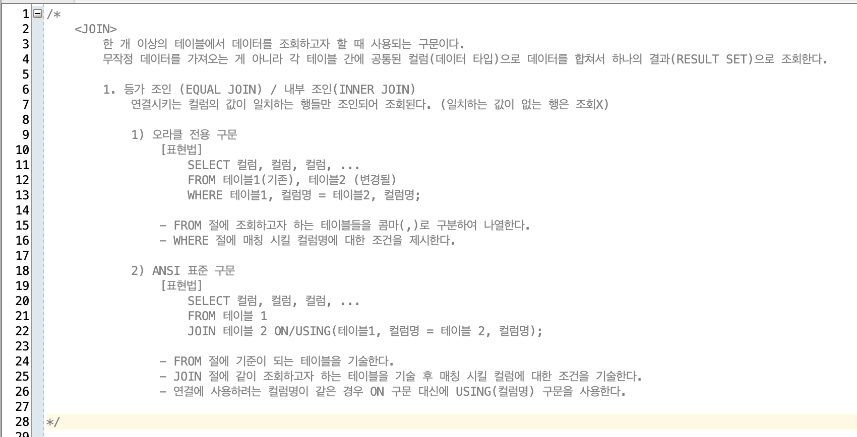 -> ANSI 표준 구문 : 국가 표준이므로 가장 많이 사용하며, 어느 DBMS에서든 적용이 가능하다. (ex. mSQL, MySQL 등)