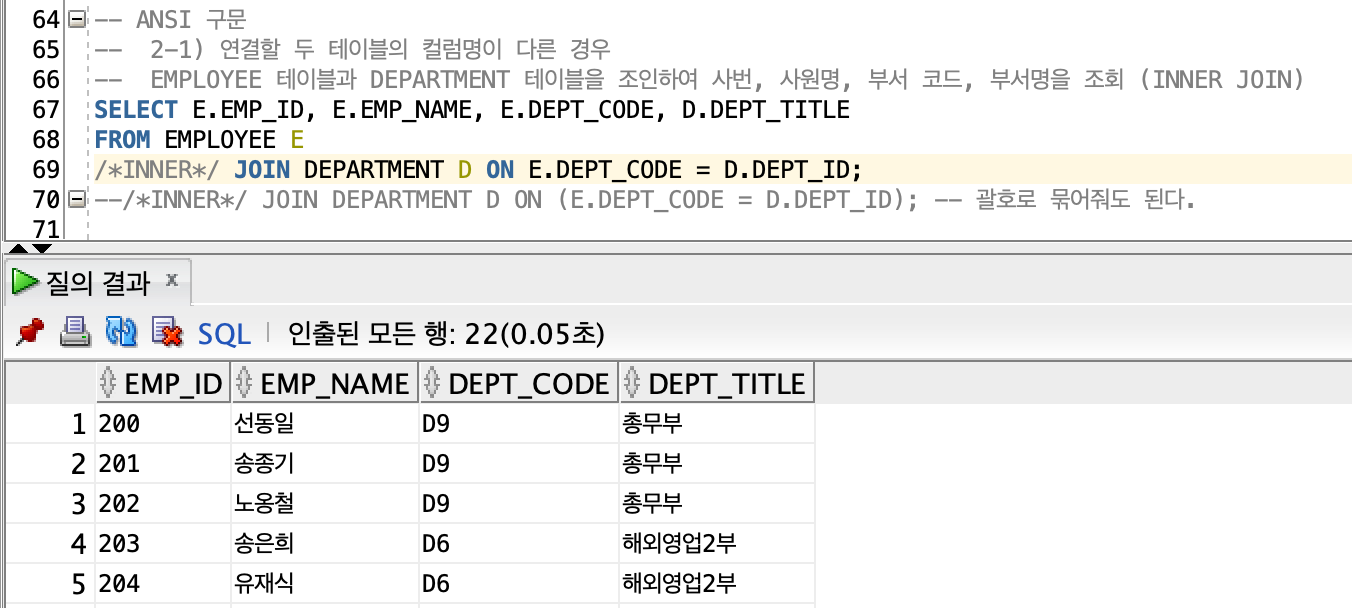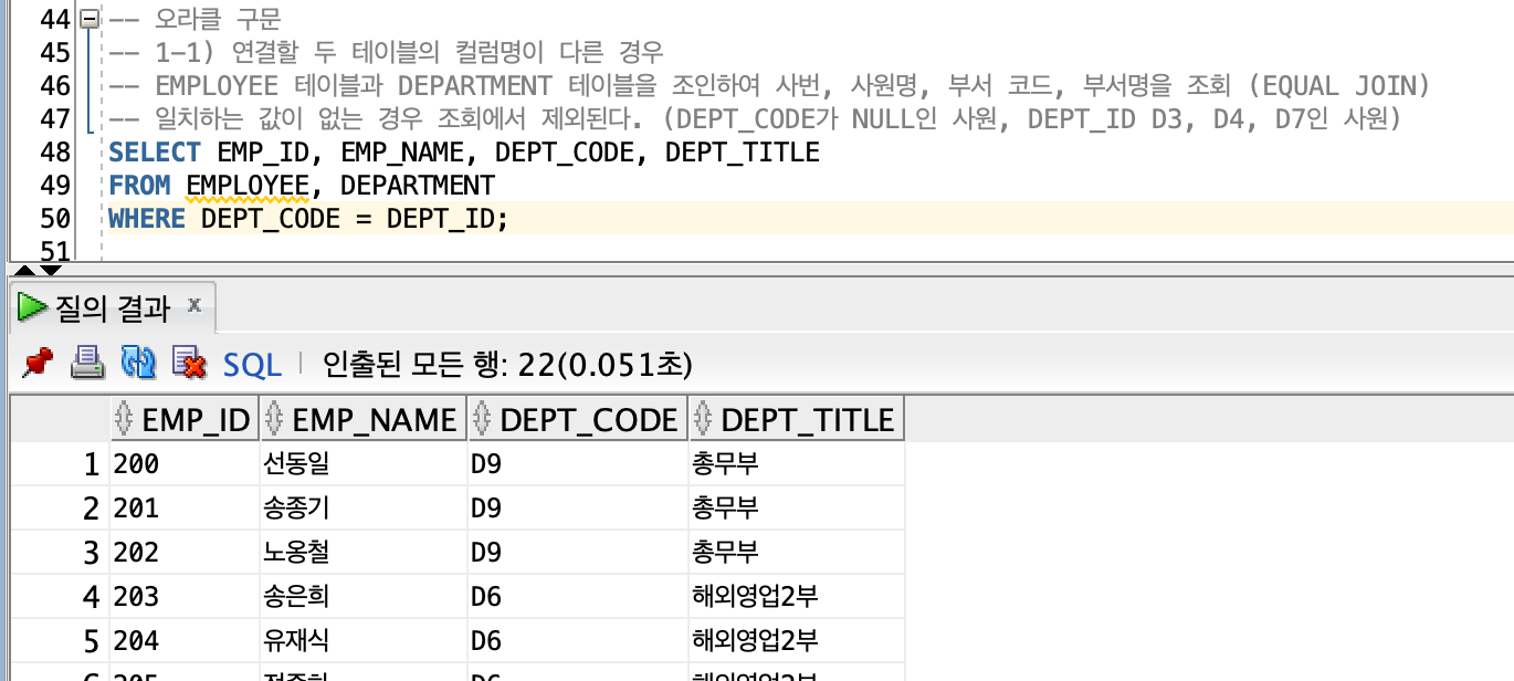 -> 오라클 구문 : 연결할 두 테이블의 컬럼명이 다른 경우