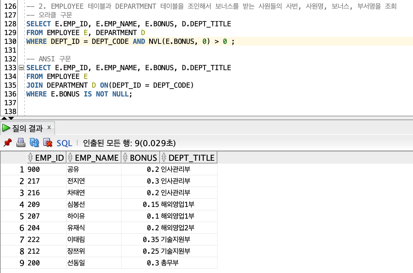 -> 실습문제 2) EMPLOYEE 테이블과 DEPARTMENT 테이블을 조인해서 보너스를 받는 사원들의 사번, 사원명, 보너스, 부서명을 조회