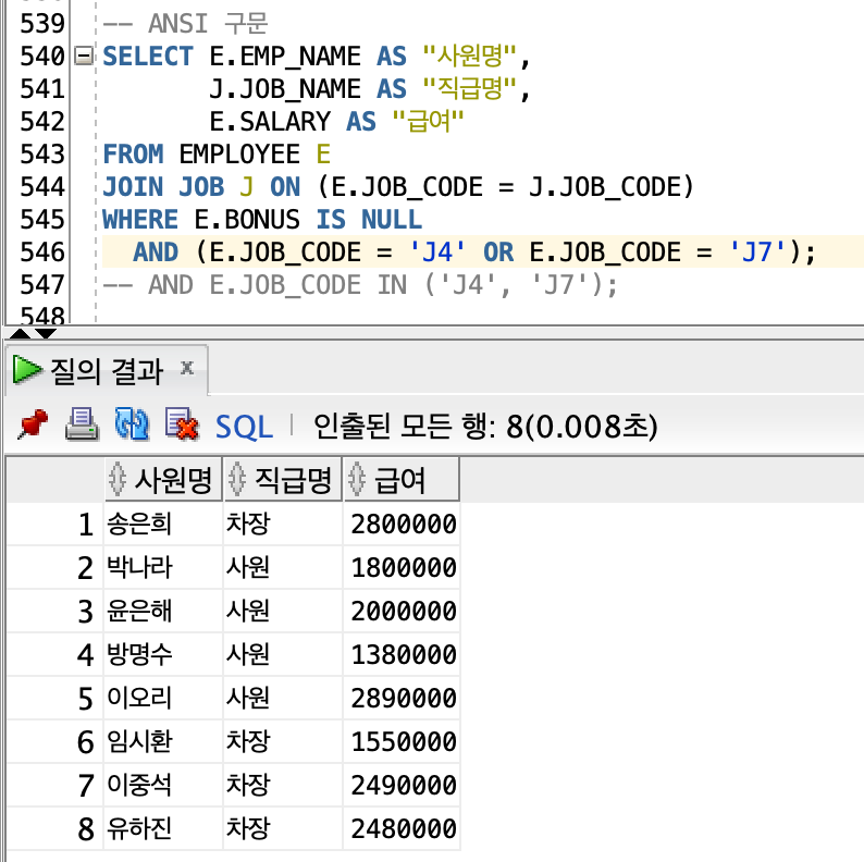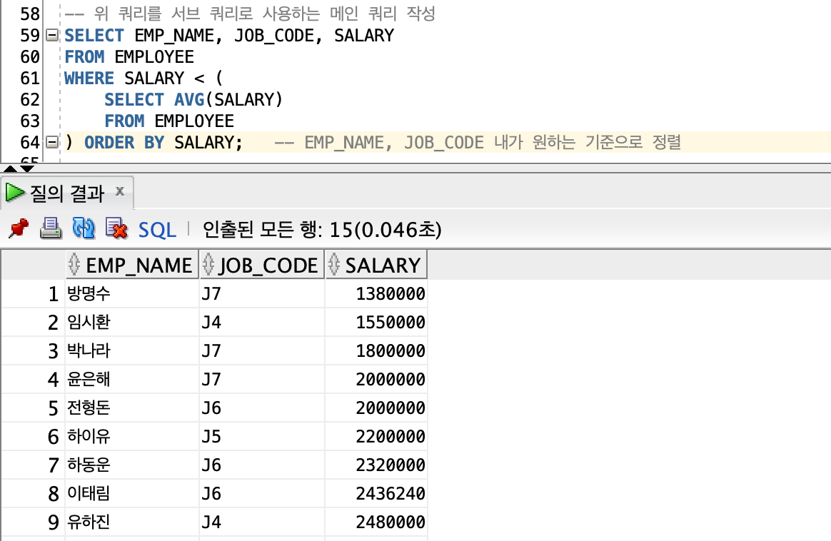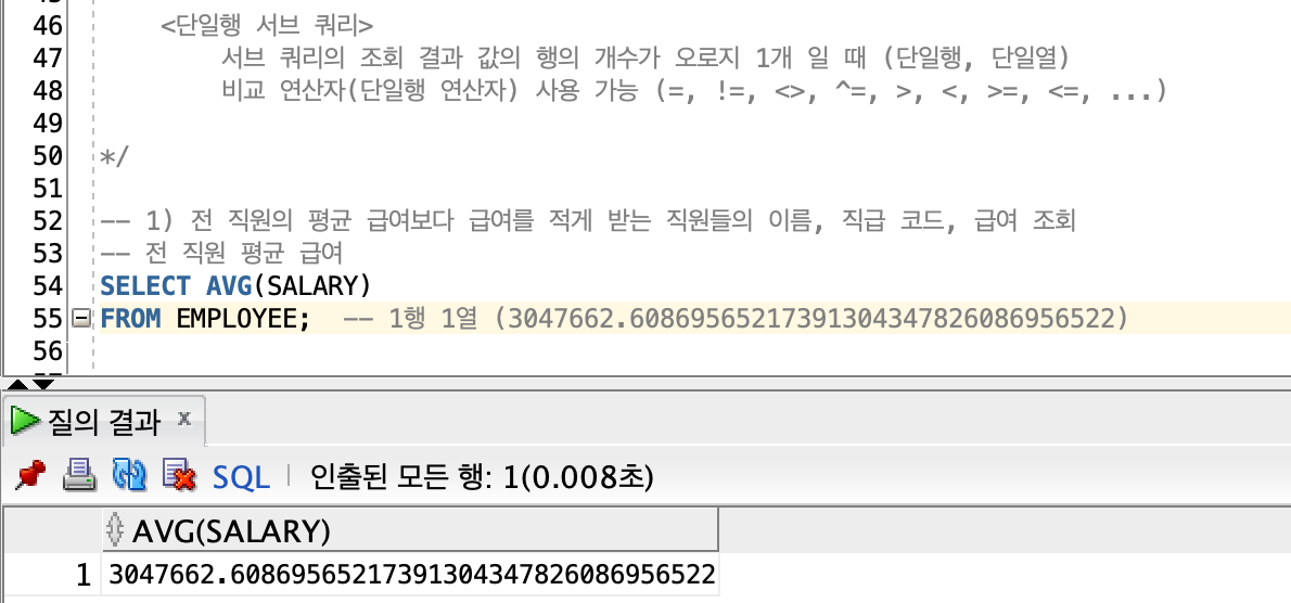 -> 서브쿼리의 조회 결과값의 개수가 1개일 때, 단일행 서브쿼리 앞에는 일반 연산자를 사용 (<, >, <=, >=, =, !=/<>/^= (서브쿼리))