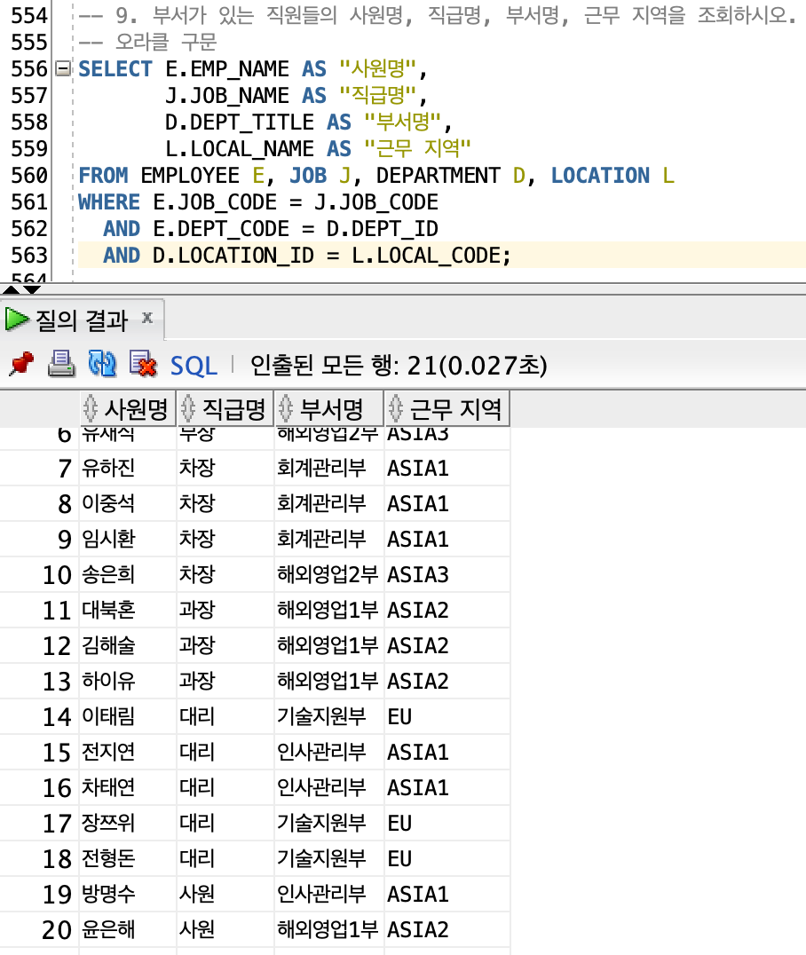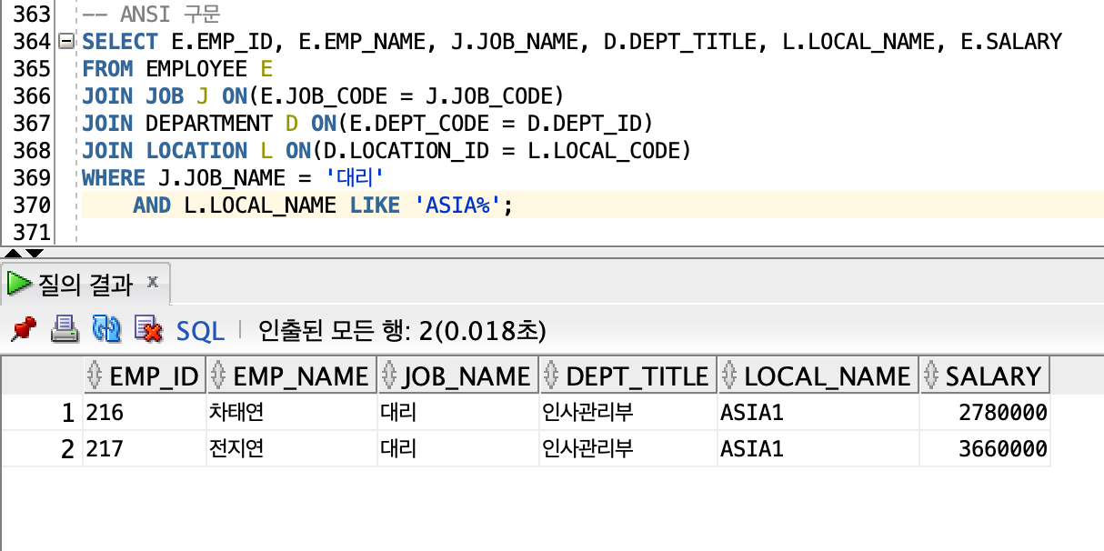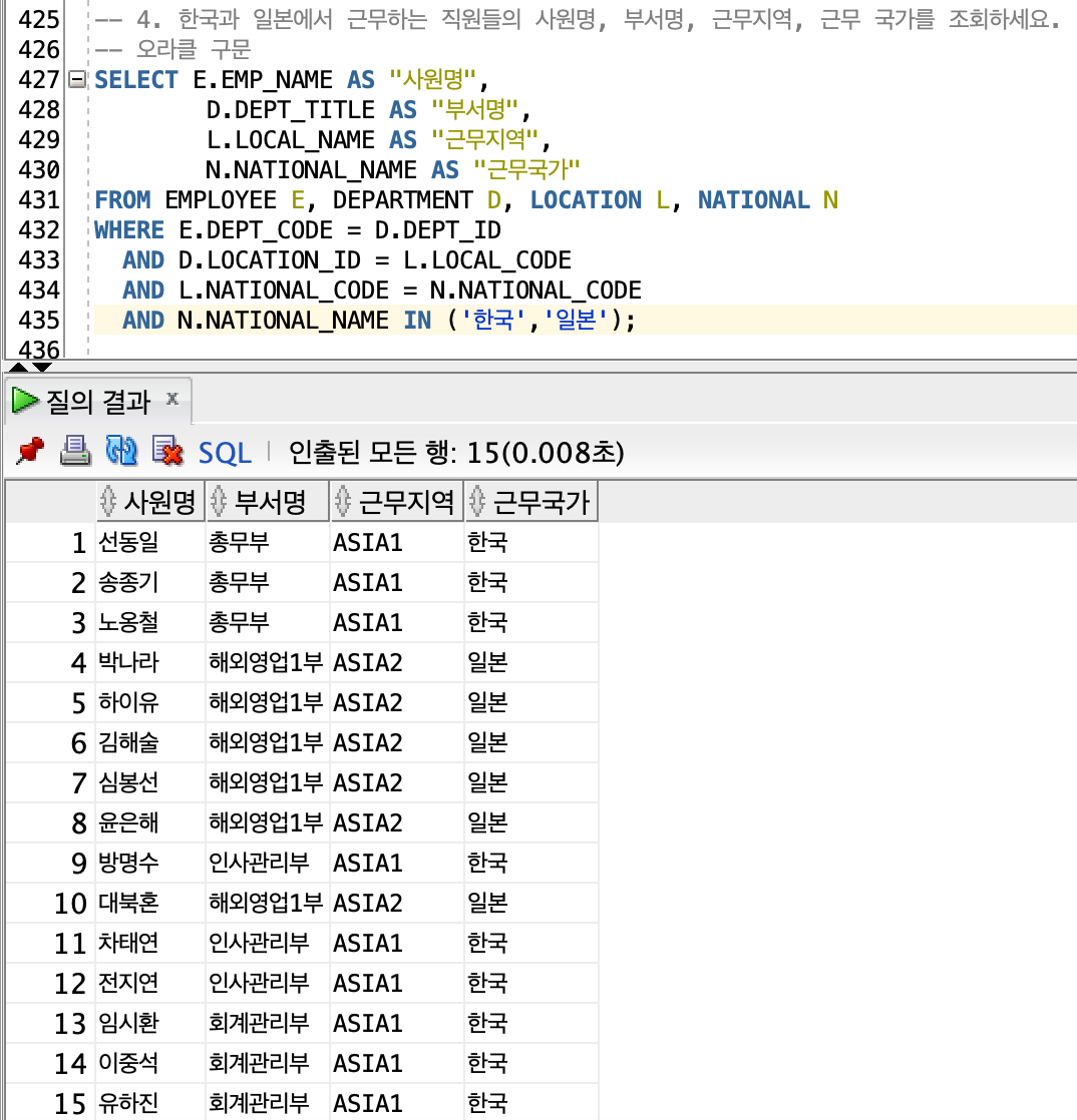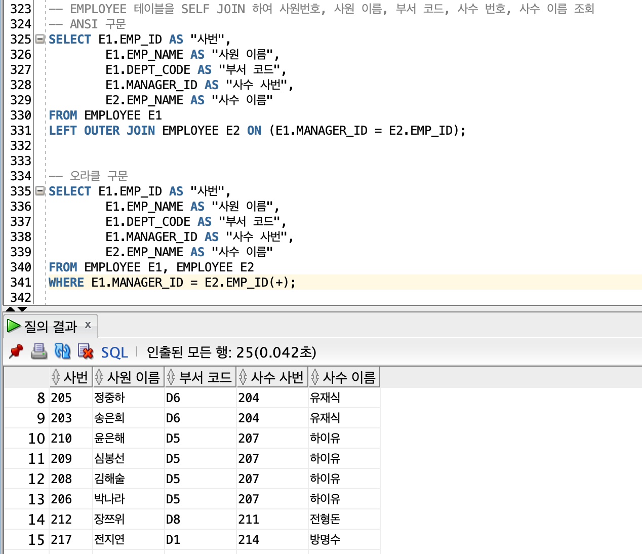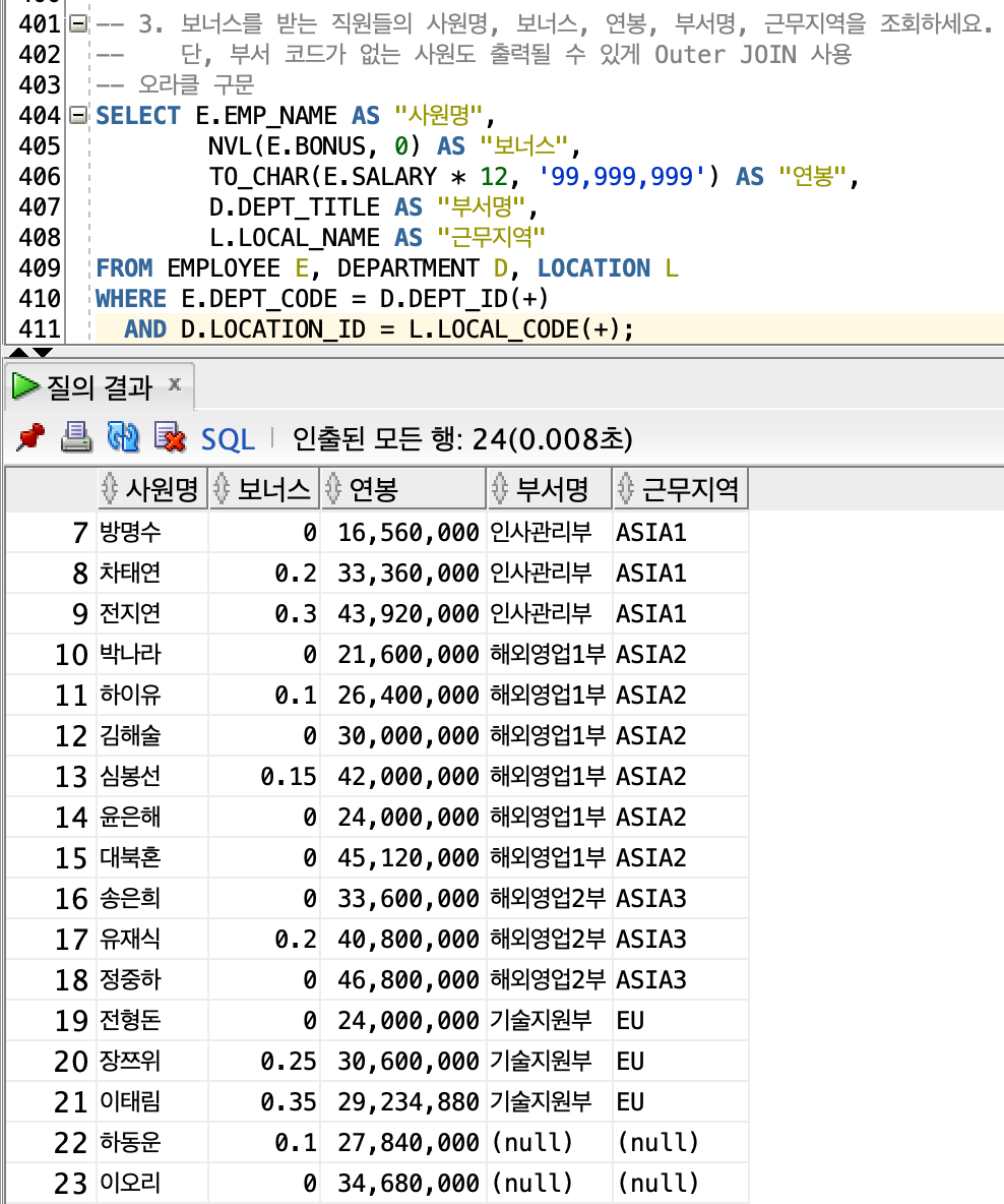 -> 오라클 구문에서는 양쪽 다 (+)연산자를 붙여줄 수 없기 때문에 D.DEPT_ID, L.LOCAL_CODE에 (+)연산자를 붙여줌으로써 원하는 값을 출력할 수 있었다.