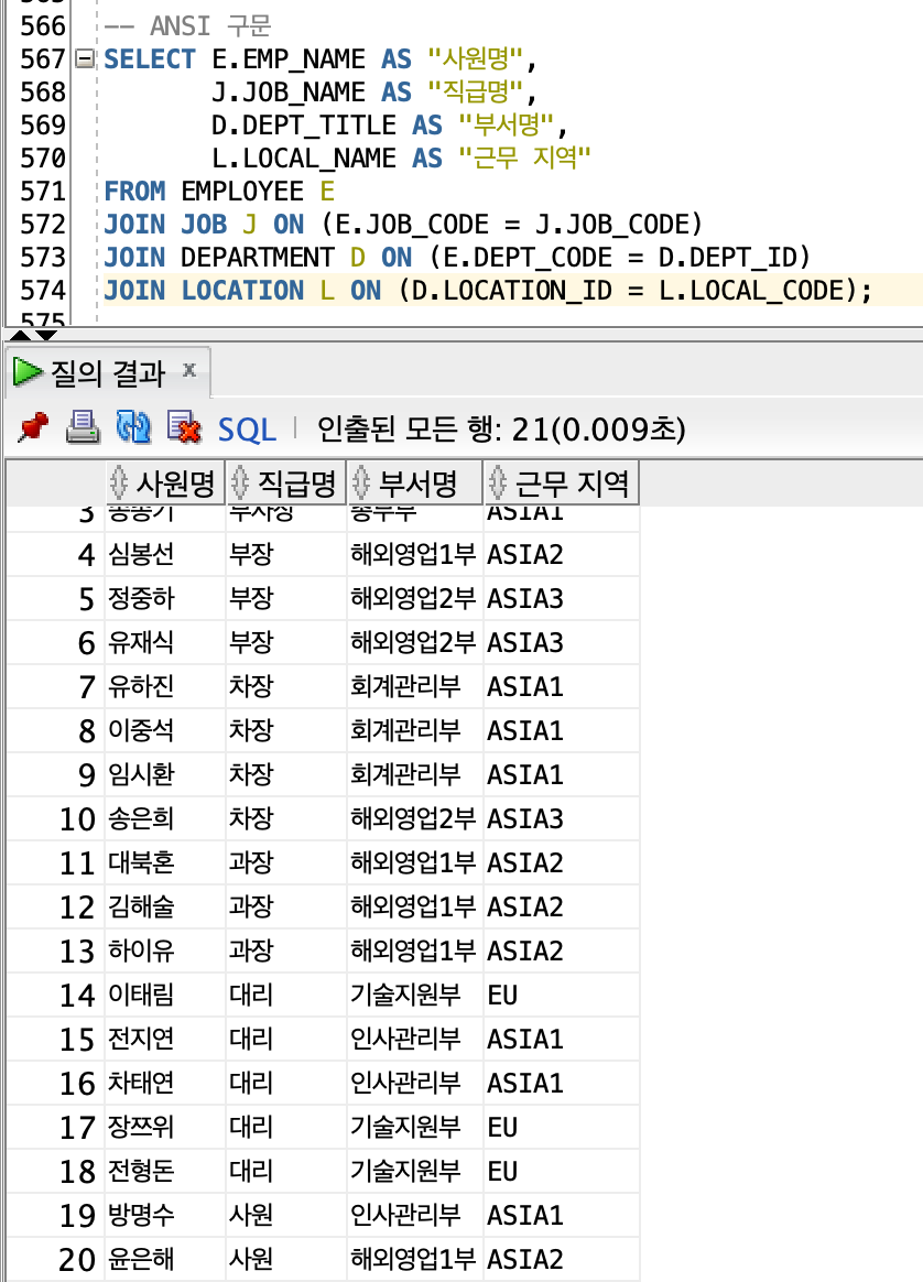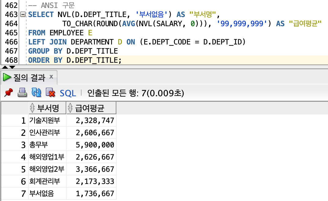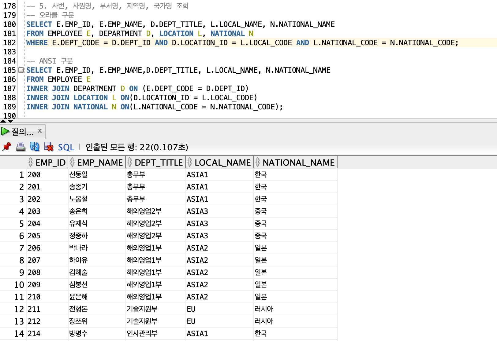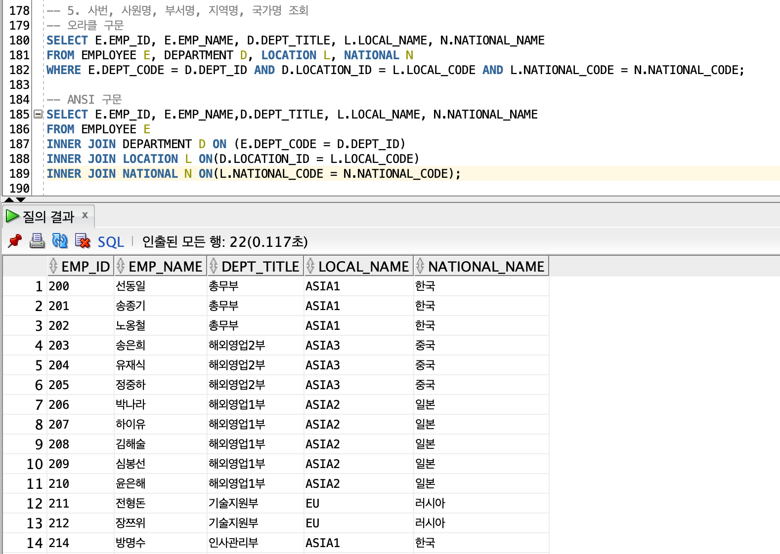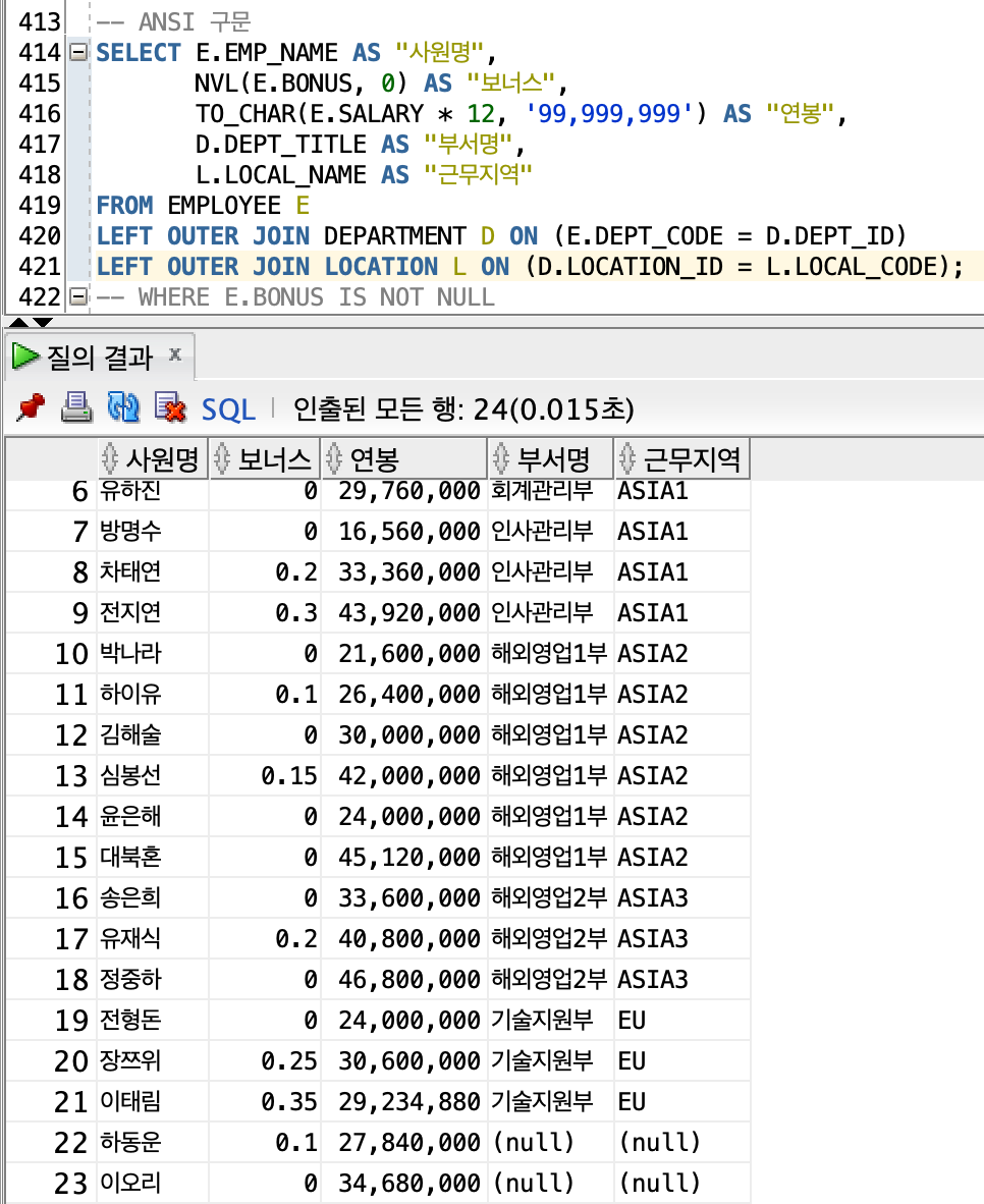 -> ANSI 구문 : JOIN된 결과에 또 JOIN을 해주게 되는데, 그냥 JOIN만 쓰게 되면 INNER JOIN이 되므로 부서코드 없는 애들이 제외되어 출력된다. -> 그러므로 JOIN된 결과에 다시 OUTER JOIN을 만들어 줌으로써 부서 코드가 없는 사원도 출력이 될 수 있도록 만들어줘야 한다.