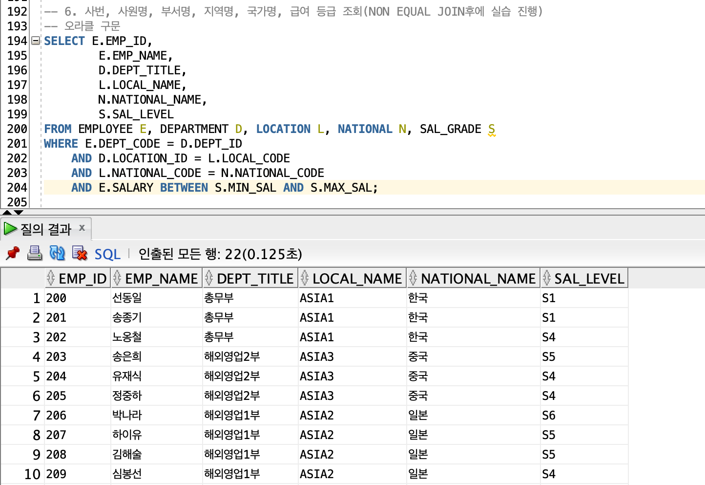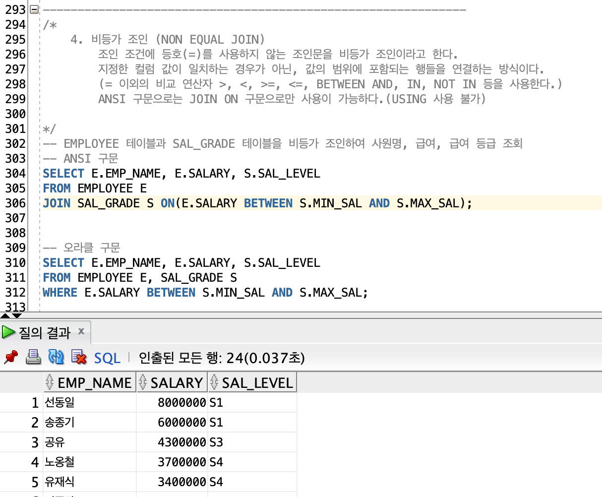 -> 등호를 사용하지 않는 모든 조인문 = 비등가 조인 : >, <, >=, <=, BETWEEN AND, IN, NOT IN 등을 사용한다.