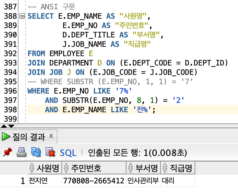 -> SUBSTR (E.EMP_NO, 1, 1) = '7' 대신에 E.EMP_NO LIKE '7%'로도 사용이 가능하다.