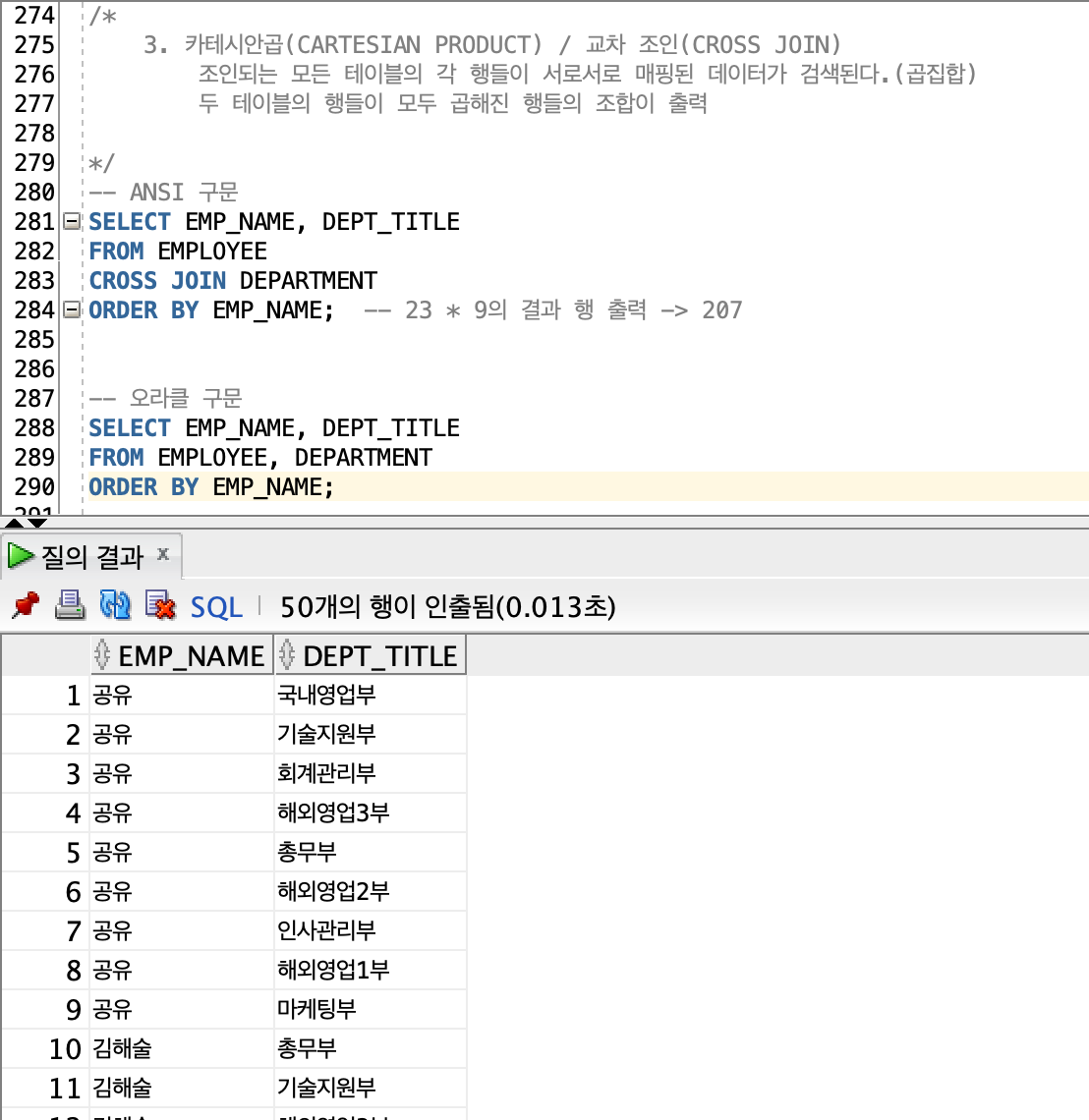 -> 카테시안 곱(Cartesian Product) 라고도 하며, 조인되는 테이블의 각 행들이 모두 매핑된 데이터가 검색되는 조인 방법이다.