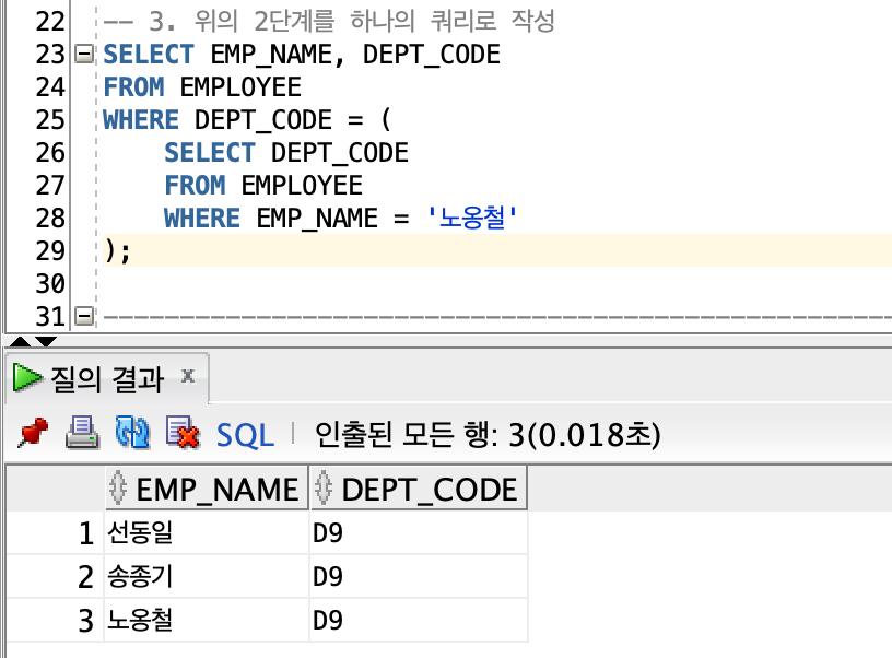 -> 3) DEPT_CODE(조회하고자 하는 조건)가 서브쿼리와 동일한(=) 데이터 조회