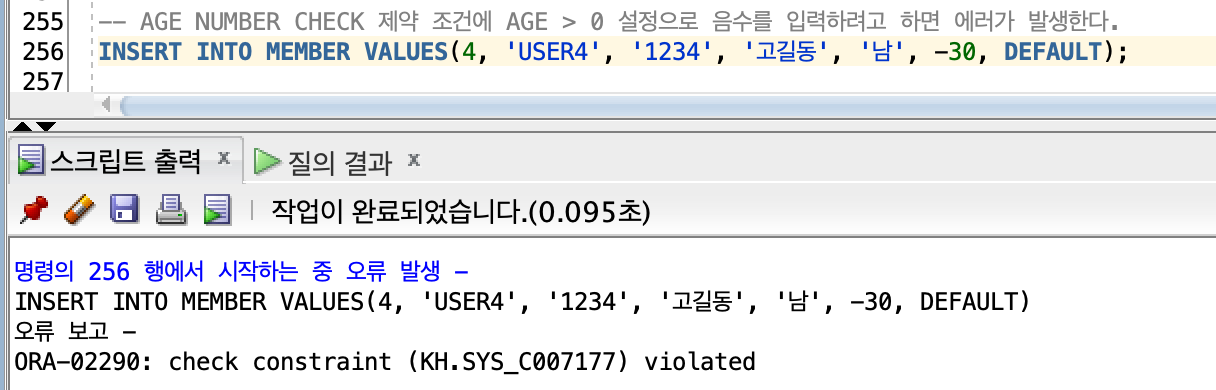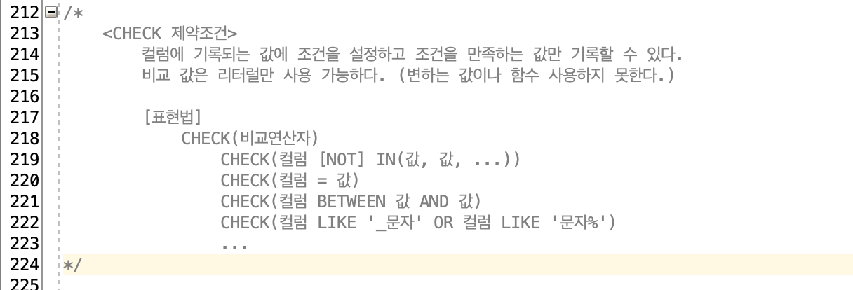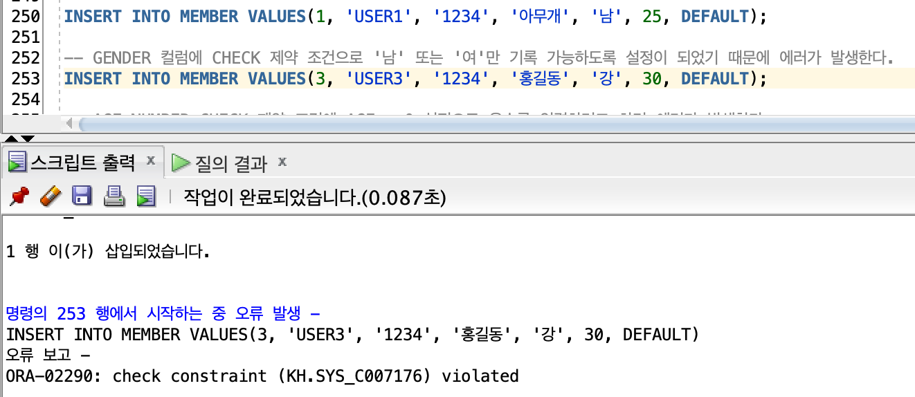 | CHECK | 저장 가능한 데이터 값의 범위나 조건을 지정하여 설정한 값만 허용 |
