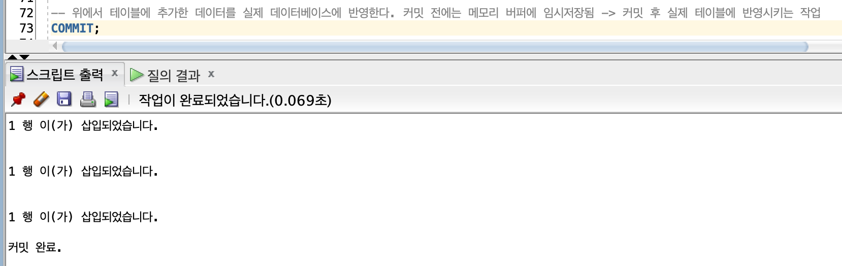 -> 커밋작업 : 커밋 전에는 추가한 데이터는 메모리 버퍼에 임시 저장 되므로 실제 테이블에 반영시키는 작업을 진행해줘야 한다.