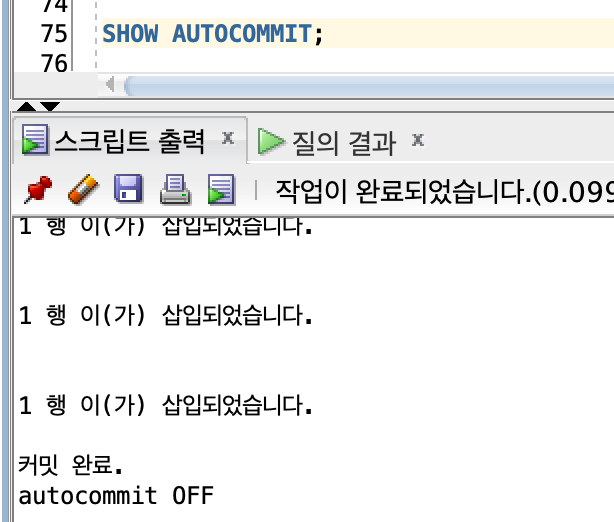 -> autocommit을 on / off 하는 명령어는 SET AUTOCOMMIT ON/OFF 로 실행시켜줄 수 있다.