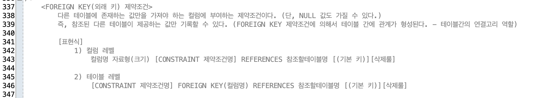 | FOREIGN KEY | 참조되는 테이블의 컬럼의 값이 존재하면 허용, 외래키 | 참조키 |