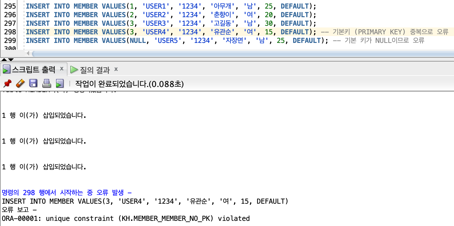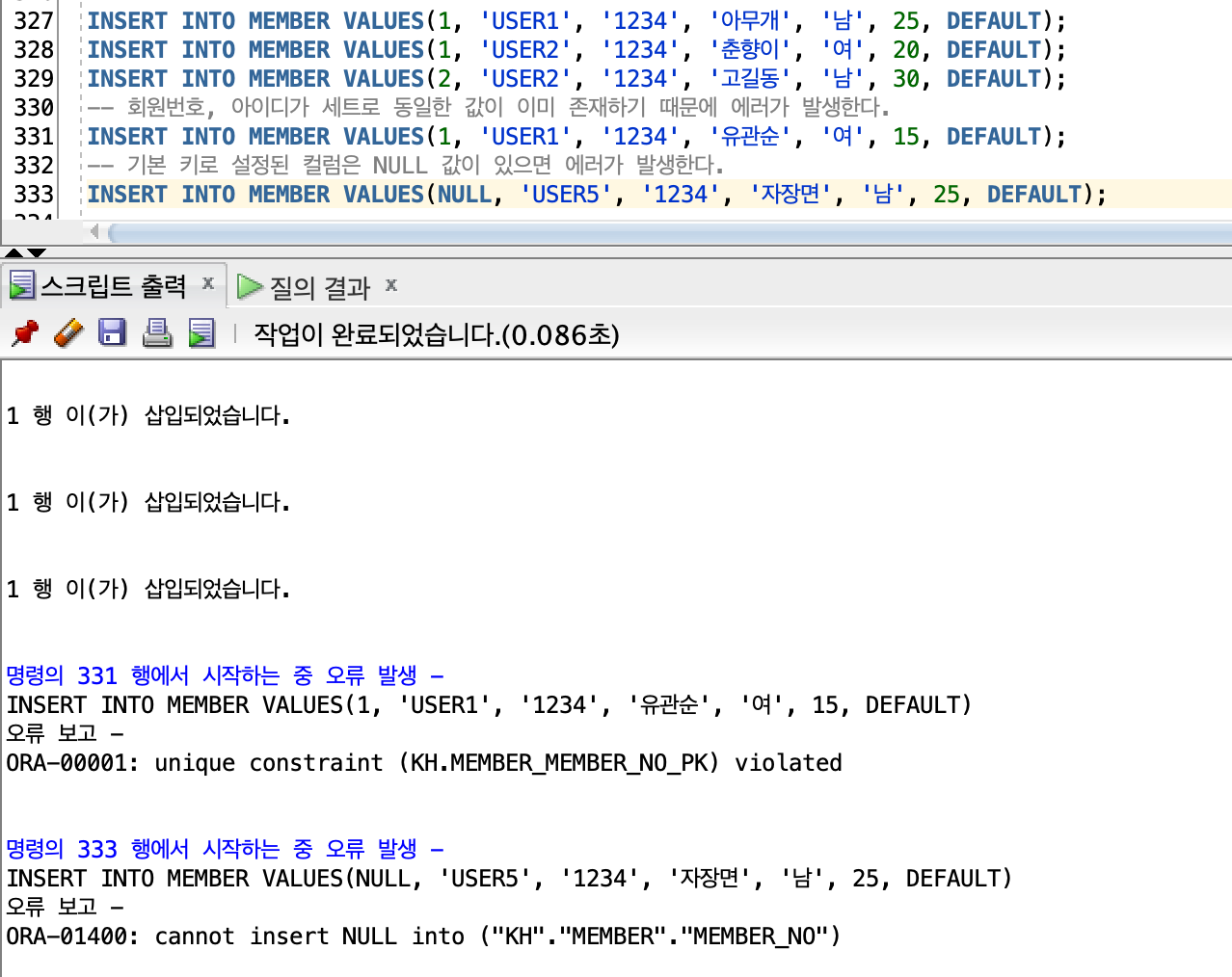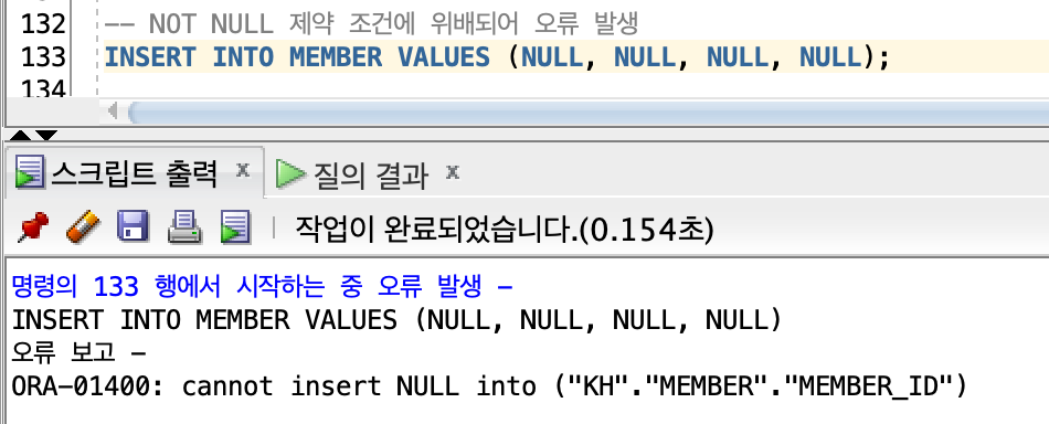 -> NOT NULL 제약조건이 설정된 테이블 생성 후 NULL이 들어있는 값을 입력하면 오류가 발생한다. (NOT NULL 제약조건 후)