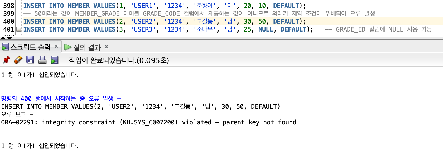 -> 부모테이블에 50이라는 값이 없기 때문에 외래키 제약 조건에 위배되어 오류가 발생한다.